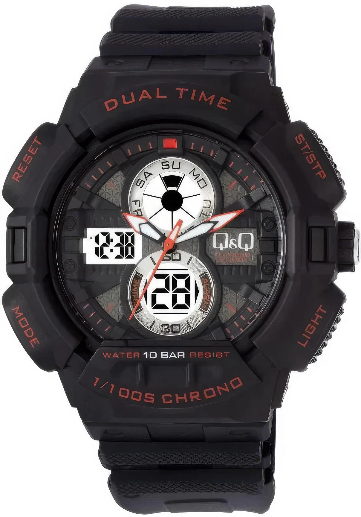 Мужские наручные часы Q&Q  GW81J002Y. Точный кварцевый механизм с аналого-цифровой индикацией. Полимерный корпус надежно защищает часы от механических повреждений. На циферблате отображается текущее число, месяц и день недели. Полимерный ремешок. Натуральный полимерный материал является идеальным для изготовления ремешка благодаря своей чрезвычайной прочности и гибкости. Прочное, устойчивое к царапинам минеральное стекло защищает часы от повреждений.Часы являются водонепроницаемыми до 10 Бар. Цвет корпуса: Черный. Ширина (с заводной головкой): 50мм. Гарантия: 1 год.