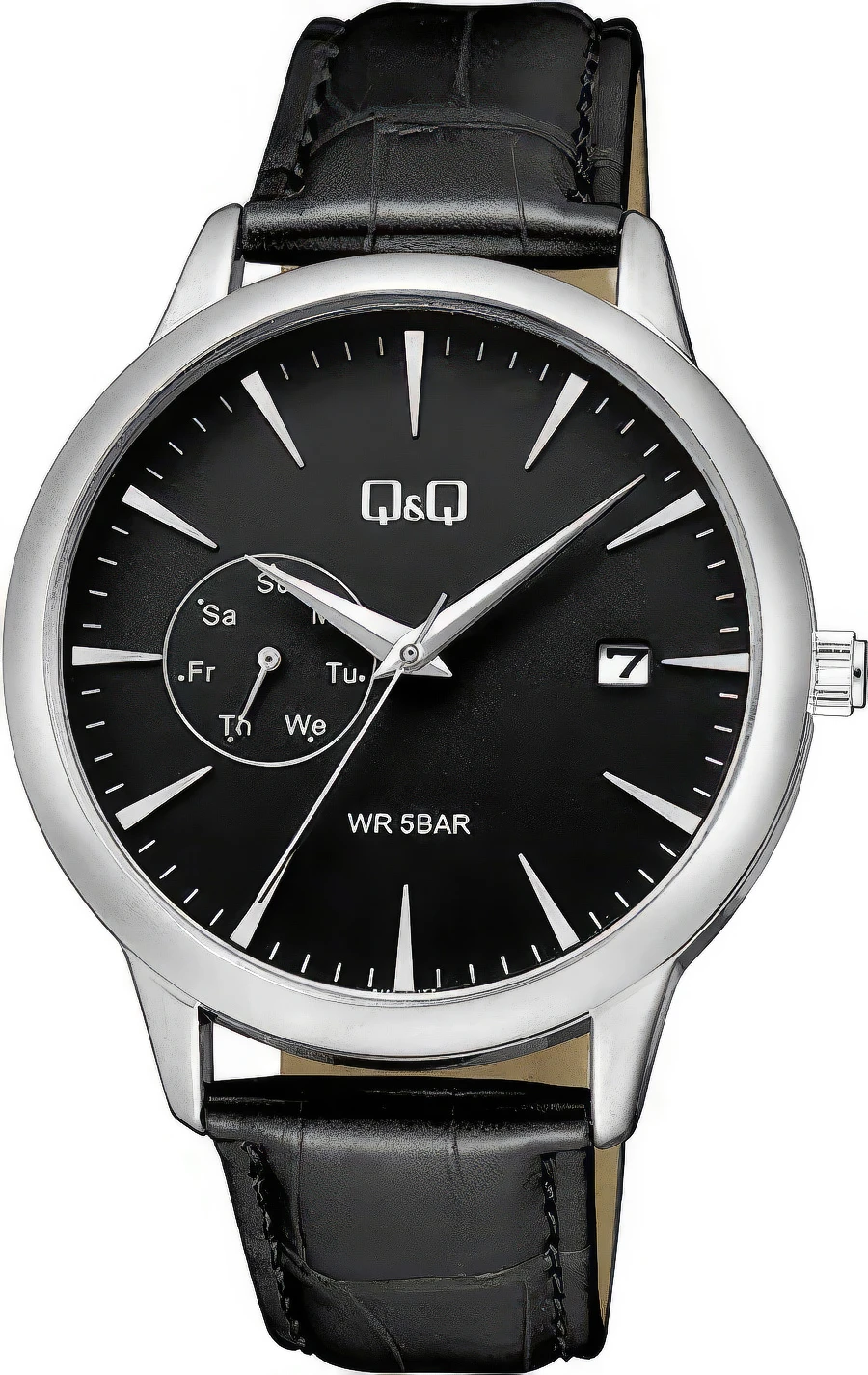 Мужские наручные часы Q&Q Casual A12AJ001Y. Точный кварцевый механизм с аналоговой индикацией. Корпус изготовлен из высококачественной часовой латуни с высокими антикоррозийными свойствами. На циферблате отображается текущее число месяца и день недели. Ремешок изготовлен из кожи. Прочное, устойчивое к царапинам минеральное стекло защищает часы от повреждений.Часы являются водонепроницаемыми до 5 Бар. Цвет корпуса: Серебристый. Цвет циферблата: Черный. Ширина (с заводной головкой): 42мм. Толщина: 9мм. Гарантия: 1 год.