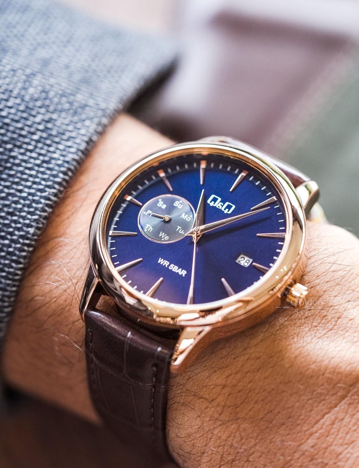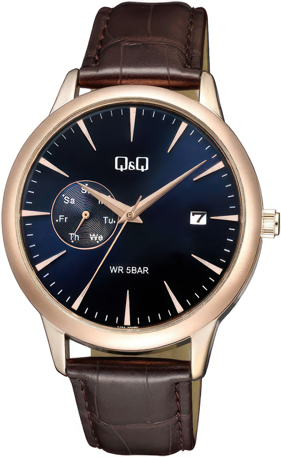 Мужские наручные часы Q&Q Casual A12AJ003Y. Точный кварцевый механизм с аналоговой индикацией. Ремешок изготовлен из кожи. Латунный браслет. Прочное, устойчивое к царапинам минеральное стекло защищает часы от повреждений. На циферблате отображается текущее число месяца и день недели. Часы являются водонепроницаемыми до 5 Бар. Цвет циферблата: Розовое золото. Цвет корпуса: Синий. Толщина: 9 мм. Гарантия: 1 год.