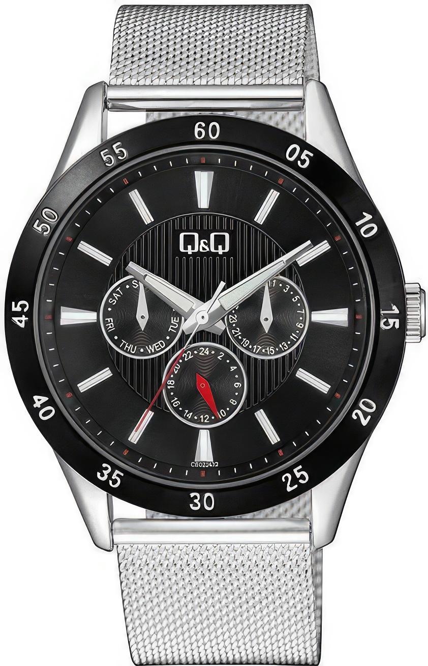Мужские наручные часы Q&Q Casual CE02J432Y. Точный кварцевый механизм с аналоговой индикацией. Браслет из нержавеющей стали. Отображение времени возможно в 12-часовом или 24-часовом формате. Латунный браслет. Прочное, устойчивое к царапинам минеральное стекло защищает часы от повреждений. На циферблате отображается текущее число месяца и день недели. Часы являются водонепроницаемыми до 3 Бар. Цвет циферблата: Серебристый. Цвет циферблата: Черный. Цвет корпуса: Черный. На стрелки и отметки нанесен светонакопительный состав, благодаря этому считывать информацию с циферблата возможно и в темноте. Толщина: 10 мм. Гарантия: 1 год.
