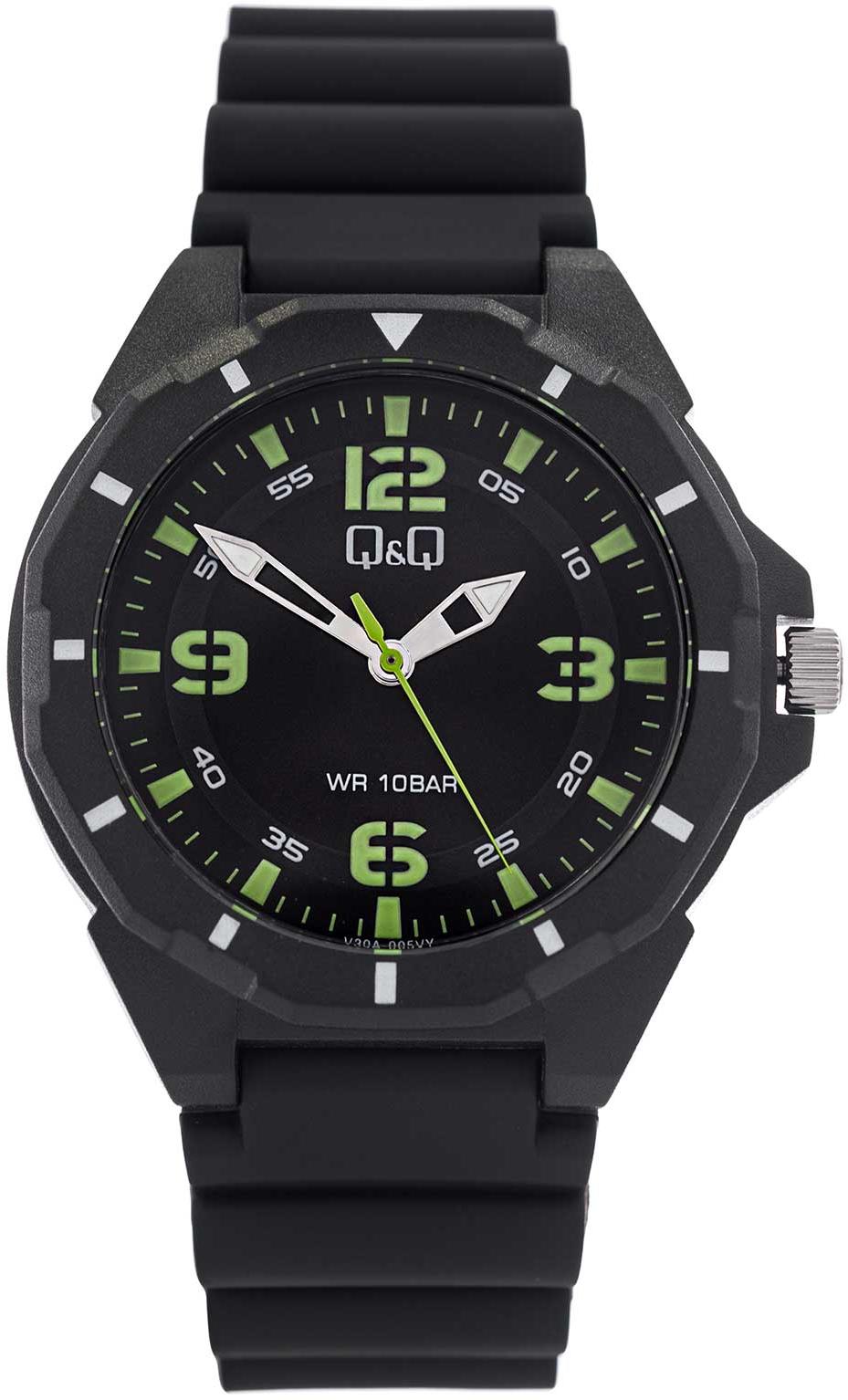 Мужские наручные часы Q&Q Casual V30AJ005Y. Точный кварцевый механизм с аналоговой индикацией. Полимерный корпус надежно защищает часы от механических повреждений. На стрелки и отметки нанесен светонакопительный состав, благодаря этому считывать информацию с циферблата возможно и в темноте. Полимерный ремешок. Натуральный полимерный материал является идеальным для изготовления ремешка благодаря своей чрезвычайной прочности и гибкости. Прочное, устойчивое к царапинам минеральное стекло защищает часы от повреждений.Часы являются водонепроницаемыми до 10 Бар. Цвет корпуса: Черный. Цвет циферблата: Черный. Ширина (с заводной головкой): 45мм. Толщина: 12мм. Гарантия: 1 год.