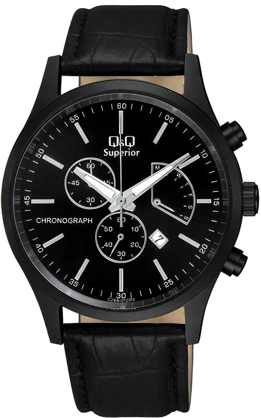 Мужские наручные часы Q&Q Superior C24AJ012Y. Точный кварцевый механизм с аналоговой индикацией. Ремешок изготовлен из кожи. Функция хронографа. Браслет из нержавеющей стали. Прочное, устойчивое к царапинам минеральное стекло защищает часы от повреждений. На циферблате отображается текущее число месяца и день недели. Часы являются водонепроницаемыми до 5 Бар. Цвет циферблата: Черный. Цвет корпуса: Черный. На стрелки и отметки нанесен светонакопительный состав, благодаря этому считывать информацию с циферблата возможно и в темноте. Толщина: 11 мм. Гарантия: 1 год.