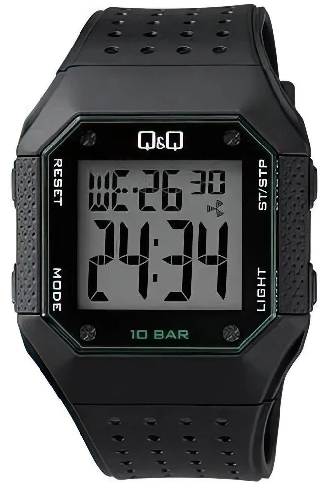 Электронные часы с точность хода не хуже -10 +15 сек./в месяц. • Ежедневный будильник со звуковым сигналом. • Секундомер. • Автоматический календарь. • Электрическая подсветка. • Легкое и прочное хезалитовое стекло. • Корпус из полимерных материалов. • Водозащита до 10 АТМ. • Черный ремешок из полимерного материала. • Простая ремешковая застежка. • Диаметр 40 мм, толщина 12 мм. Вес 48 мм.