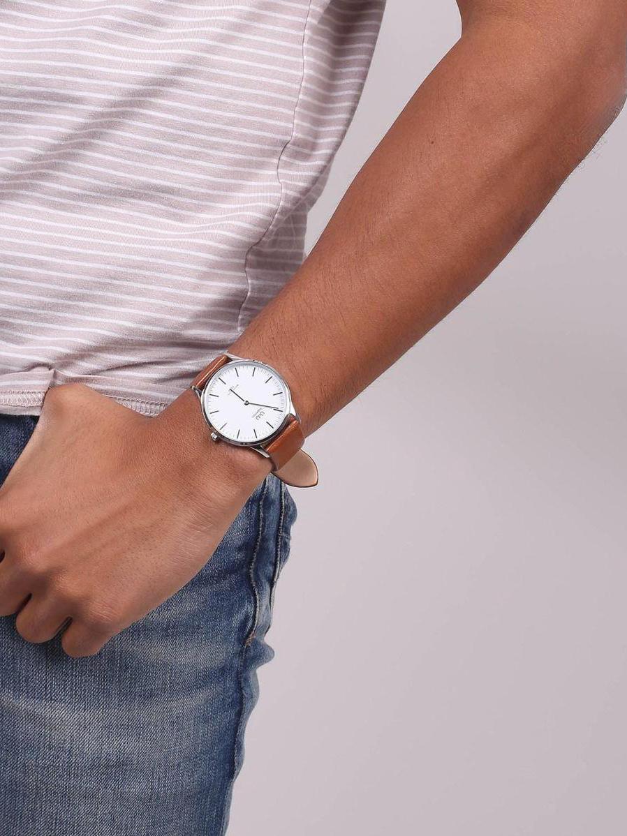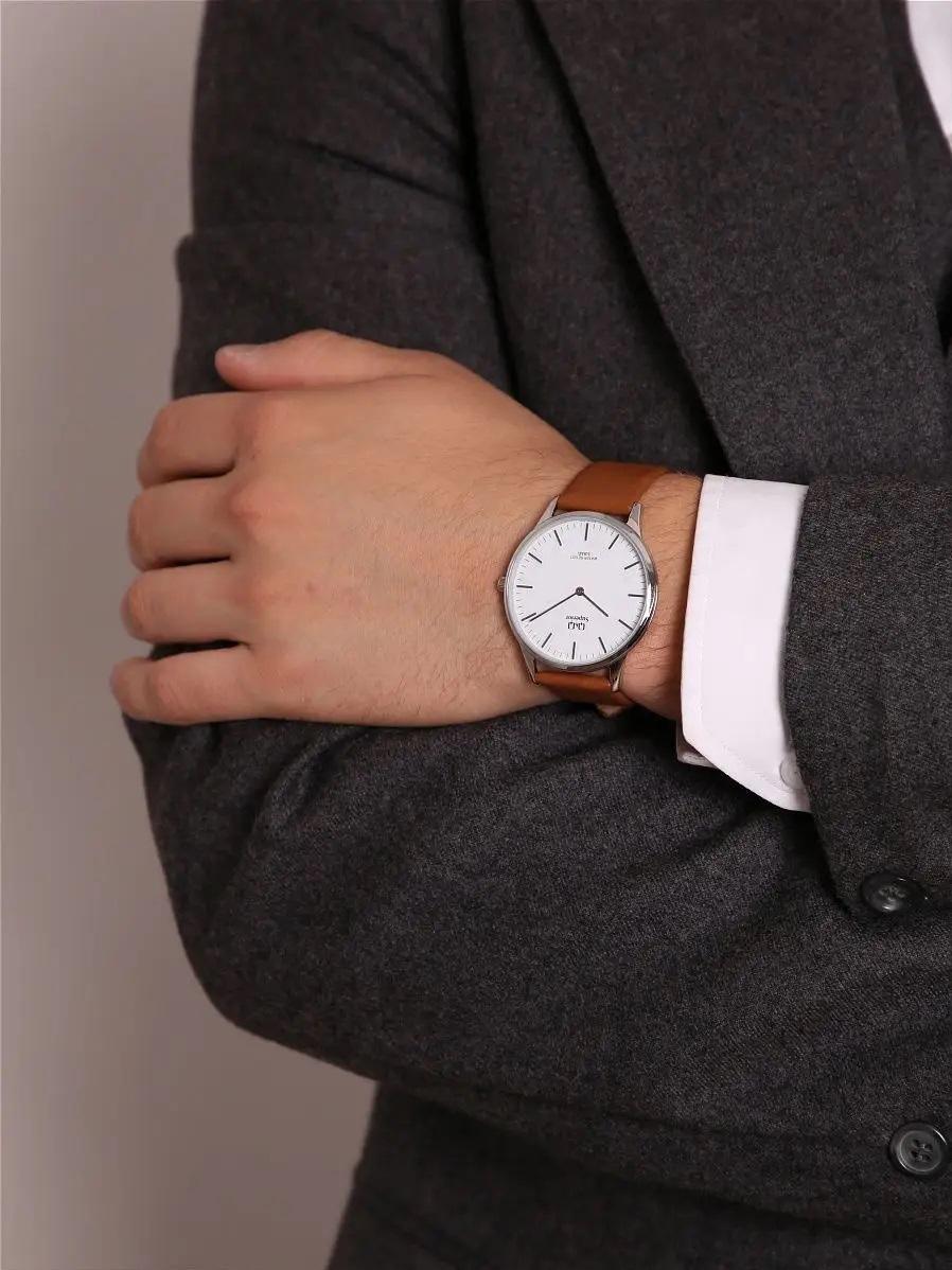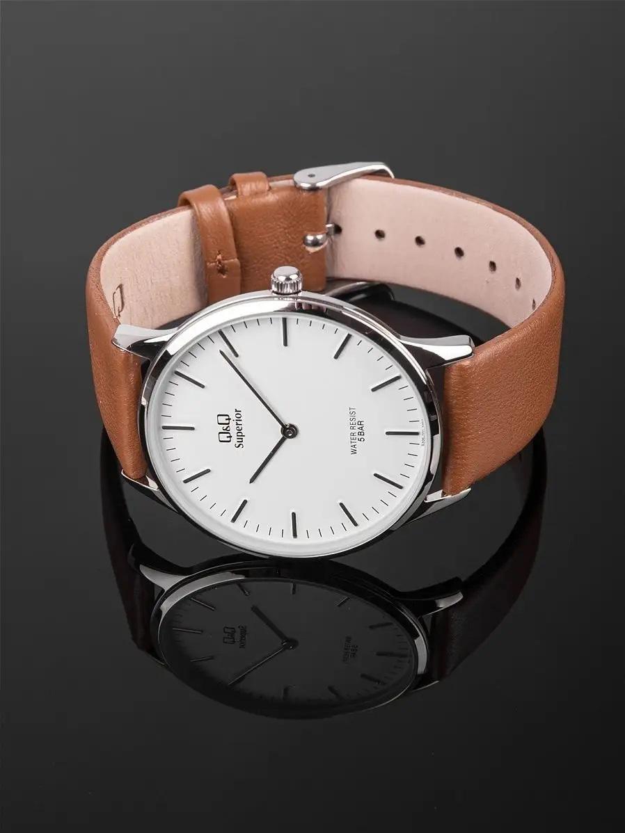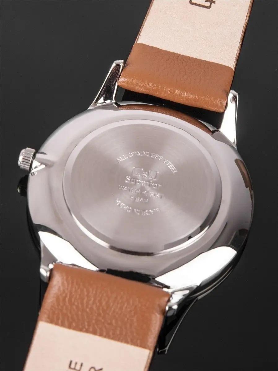 Точный кварцевый механизм. Часовая и минутная стрелки. • Точность хода не хуже -10 +15 сек./в месяц. • Минеральное стекло устойчивое к возникновению царапин. • Корпус из высококачественного стального сплава 316L с высокими антикоррозийными свойствами. • Водозащита до 5 АТМ. • Кожаный ремешок. • Классическая застёжка ремешка.• Диаметр корпуса 40 мм, толщина 7 мм.