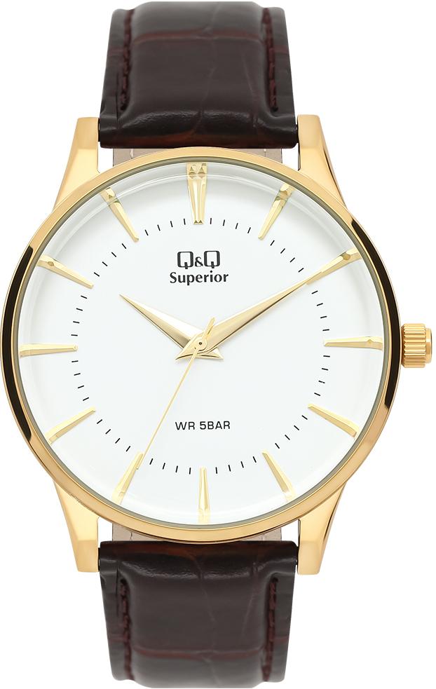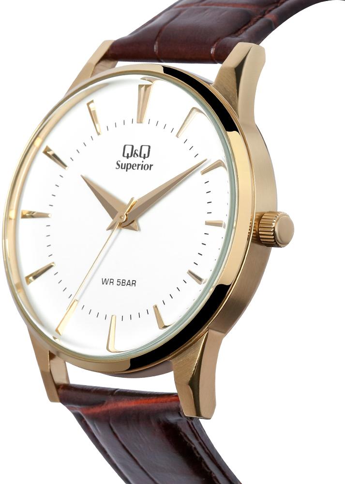 Мужские наручные часы Q&Q Superior S398J101Y. Точный кварцевый механизм с аналоговой индикацией. Ремешок изготовлен из кожи. Браслет из нержавеющей стали. Прочное, устойчивое к царапинам минеральное стекло защищает часы от повреждений. Часы являются водонепроницаемыми до 5 Бар. Цвет циферблата: Желтое золото. Цвет корпуса: Белый. Толщина: 8 мм. Гарантия: 1 год.