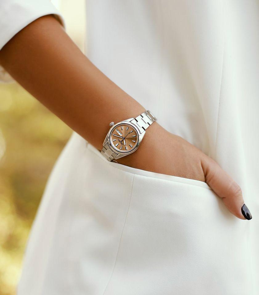 Женские наручные часы Seiko CS Dress SUR351P1. Точный кварцевый механизм с аналоговой индикацией. Корпус изготовлен из высококачественной нержавеющей стали 316L с высокими антикоррозийными свойствами. На стрелки и отметки нанесен светонакопительный состав, благодаря этому считывать информацию с циферблата возможно и в темноте. На циферблате отображается текущее число месяца и день недели. Браслет из нержавеющей стали. Сапфировое стекло. Искусственно изготовленное стекло с высокой прочностью и устойчивостью к царапинам. Часы являются водонепроницаемыми до 3 Бар. Цвет корпуса: Серебристый. Цвет циферблата: Оранжевый. Гарантия: 2 года.