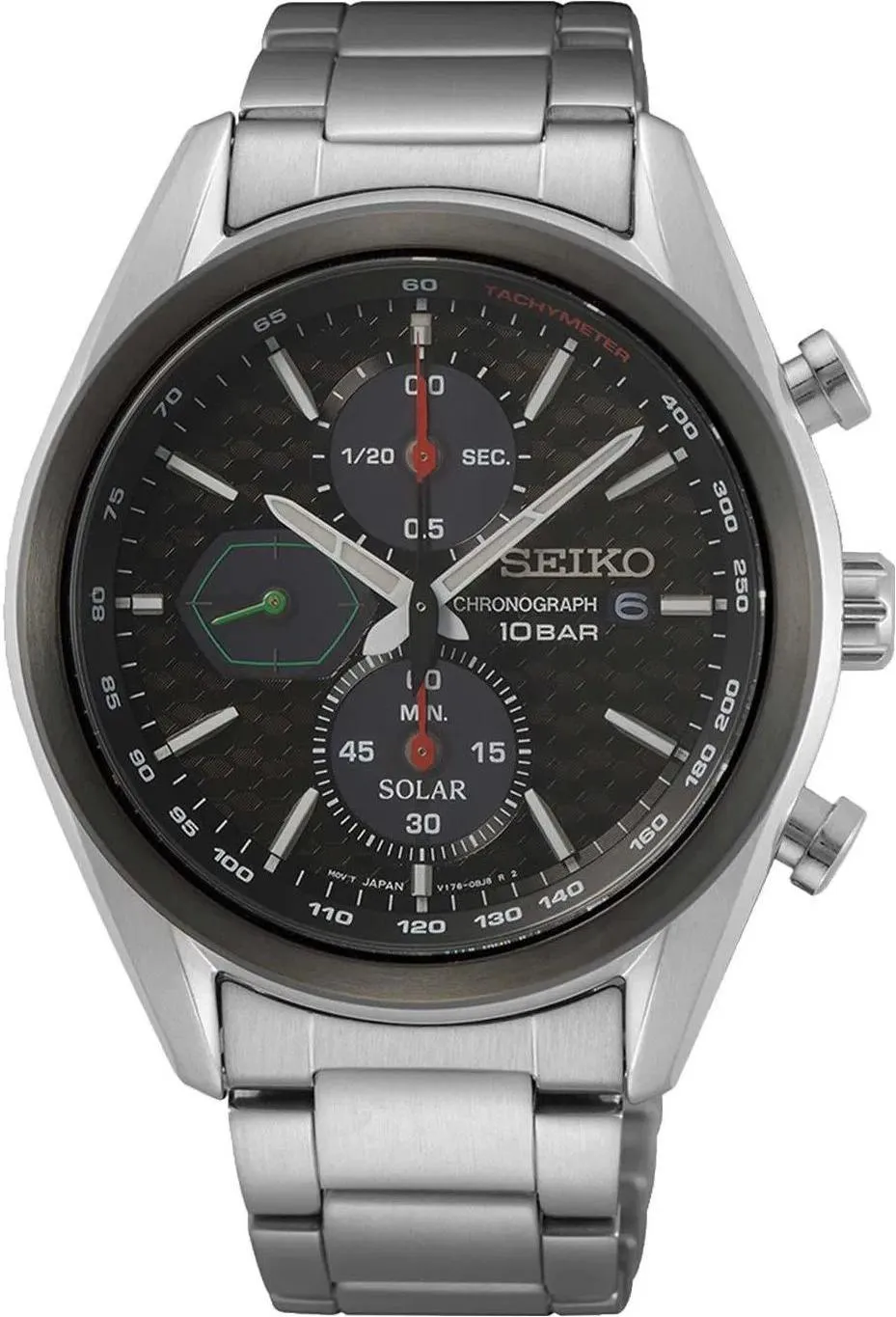 Мужские наручные часы Seiko CS Sports SSC803P1. Точный кварцевый механизм с аналоговой индикацией. Корпус изготовлен из высококачественной нержавеющей стали 316L с высокими антикоррозийными свойствами. На стрелки и отметки нанесен светонакопительный состав, благодаря этому считывать информацию с циферблата возможно и в темноте. На циферблате отображается текущее число месяца. Солнечная батарейка. Солнечная подзаряжающаяся батарейка обеспечивает питание часов для работы. Функция хронографа. Браслет из нержавеющей стали. Сапфировое стекло. Искусственно изготовленное стекло с высокой прочностью и устойчивостью к царапинам. Часы являются водонепроницаемыми до 10 Бар. Цвет корпуса: Серебристый. Цвет циферблата: Черный. Гарантия: 2 года.