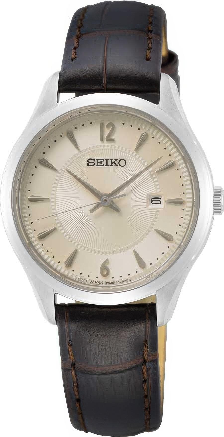 Женские наручные часы Seiko Discover More SUR427P1. Точный кварцевый механизм с аналоговой индикацией. Ремешок изготовлен из кожи. Браслет из нержавеющей стали. Сапфировое стекло. Искусственно изготовленное стекло с высокой прочностью и устойчивостью к царапинам. На циферблате отображается текущее число месяца. Часы являются водонепроницаемыми до 10 Бар. Цвет циферблата: Серебристый. Цвет корпуса: Бежевый. Высота (с ушками): 36 мм. Толщина: 14 мм. Гарантия: 2 года.