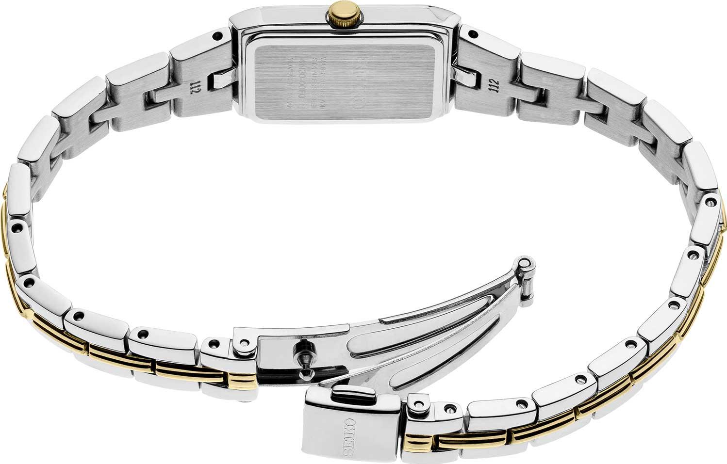 Женские кварцевые часы с белым циферблатом и центральными часовой и минутной стрелками воплощают элегантность и утонченность. Прямоугольный корпус из нержавеющей стали с частичным PVD-покрытием под желтое золото имеет изящные размеры: ширину 15,5 мм и толщину 5,6 мм. Модель дополнена стальным браслетом с частичным покрытием и раскладывающейся застежкой, обеспечивающей удобство ношения. Циферблат защищен минеральным стеклом Hardlex, устойчивым к повреждениям, а уровень водонепроницаемости WR 30 гарантирует защиту от брызг. Эти часы станут идеальным аксессуаром для тех, кто ценит сдержанный стиль и надежность.
