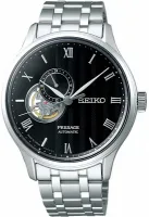 Мужские механические часы с автоподзаводом. Калибр механизма 4R39 на 24 камнях. Запас хода 41 час. Центральные часовая, минутная и секундная стрелки. 12/24 часовой формат времени. Черный циферблат с открытым балансом хода. Римская индикация времени. Круглый корпус выполнен из нержавеющей стали. Диаметр корпуса составляет 41,8 мм, толщина 12,5 мм. Стальной браслет, раскладывающаяся застежка. Устойчивое к возникновению царапин сапфировое стекло. Водостойкость WR 30.