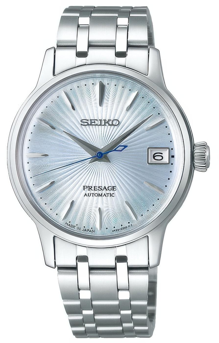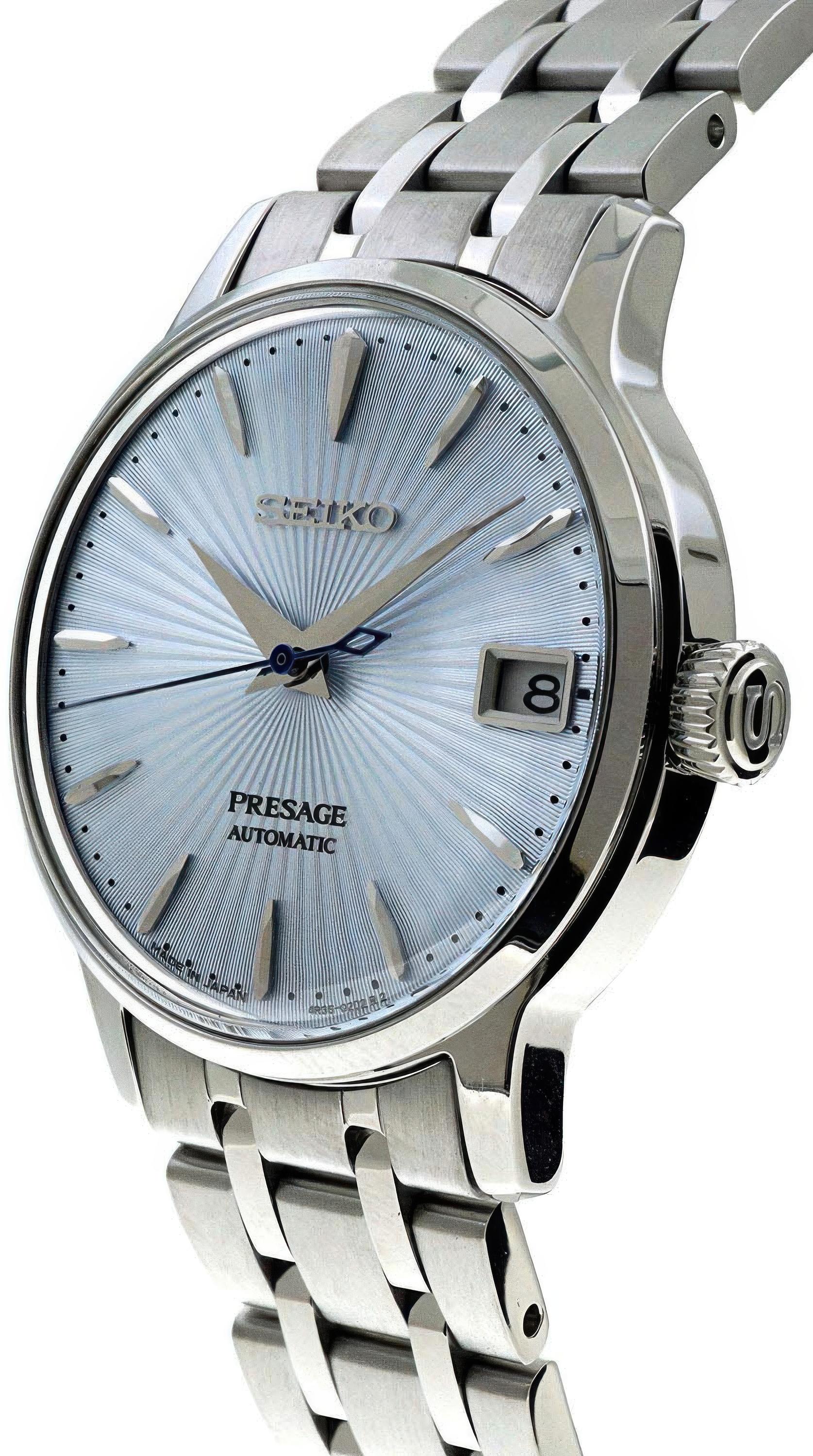 Женские наручные часы Seiko Presage SRP841J1. Механические с ручным подзаводом. Браслет из нержавеющей стали. Браслет из нержавеющей стали. Прочное, устойчивое к царапинам минеральное стекло защищает часы от повреждений. На циферблате отображается текущее число месяца. Часы являются водонепроницаемыми до 5 Бар. Цвет циферблата: Серебристый. Цвет корпуса: Голубой. Высота (с ушками): 40 мм. Толщина: 11 мм. Гарантия: 2 года.