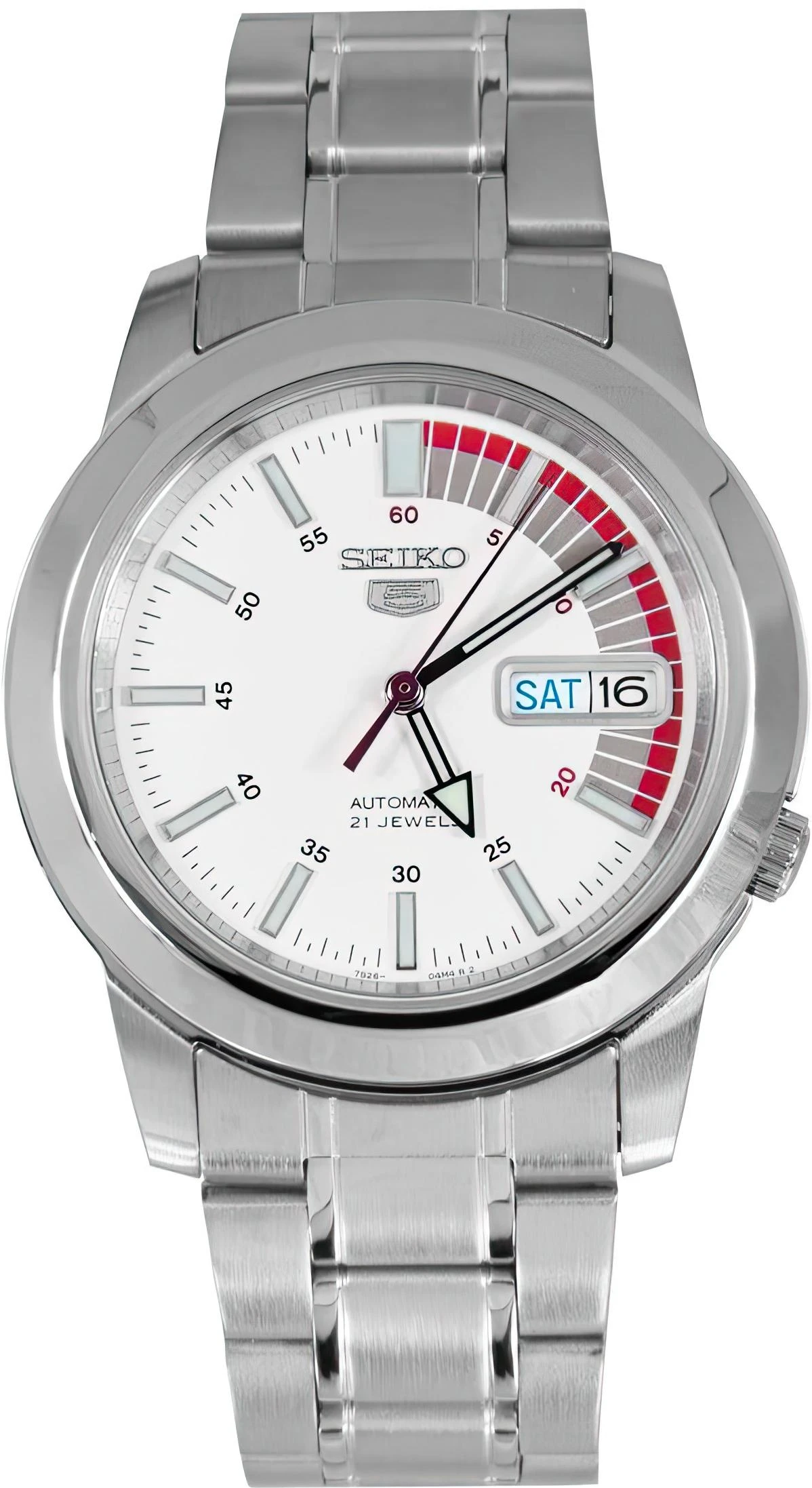 Мужские наручные часы Seiko Seiko 5 SNKK25K1. Механические с ручным подзаводом. Корпус изготовлен из высококачественной нержавеющей стали 316L с высокими антикоррозийными свойствами. На стрелки и отметки нанесен светонакопительный состав, благодаря этому считывать информацию с циферблата возможно и в темноте. На циферблате отображается текущее число месяца и день недели. Браслет из нержавеющей стали. Прочное, устойчивое к царапинам минеральное стекло защищает часы от повреждений. Часы являются водонепроницаемыми до 5 Бар. Цвет корпуса: Серебристый. Цвет циферблата: Белый. Ширина (с заводной головкой): 38мм. Толщина: 10мм. Гарантия: 2 года.