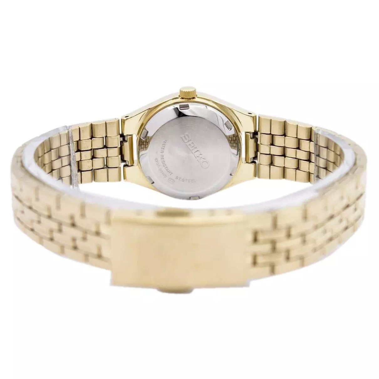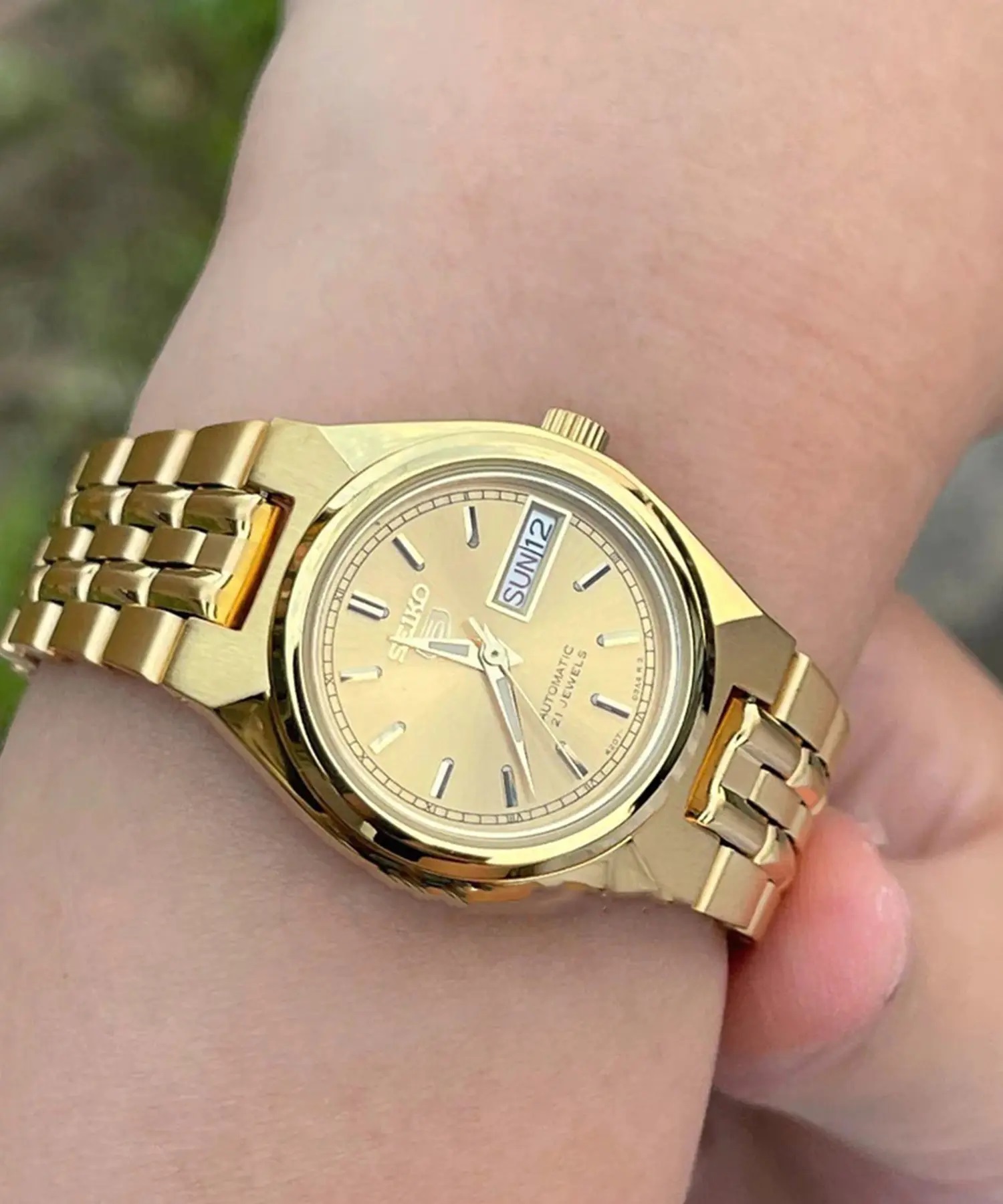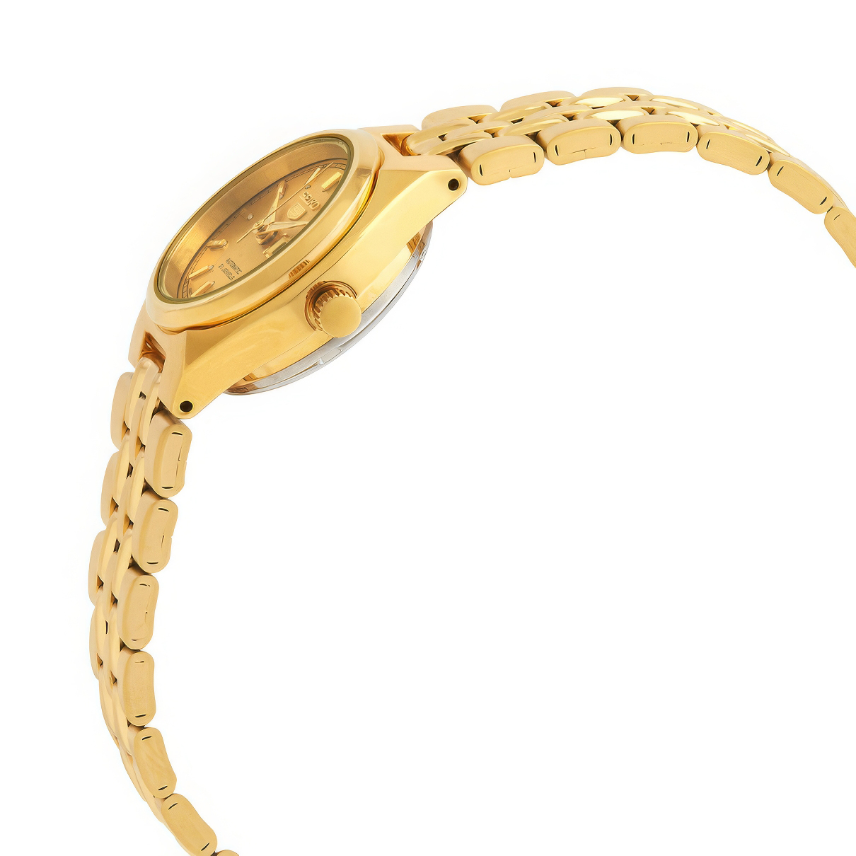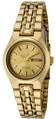 Женские наручные часы Seiko Seiko 5 SYMA04K1. Механические с автоподзаводом. Пружина механизма заводится автоматически благодаря естественным движениям владельца в процессе ежедневной носки часов. Корпус изготовлен из высококачественной нержавеющей стали 316L с высокими антикоррозийными свойствами. На стрелки и отметки нанесен светонакопительный состав, благодаря этому считывать информацию с циферблата возможно и в темноте. На циферблате отображается текущее число месяца и день недели. Браслет из нержавеющей стали. Прочное, устойчивое к царапинам минеральное стекло защищает часы от повреждений. Часы являются водонепроницаемыми до 3 Бар. Цвет корпуса: Желтое золото. Цвет циферблата: Золотистый. Ширина (с заводной головкой): 24мм. Толщина: 11мм. Гарантия: 2 года.
