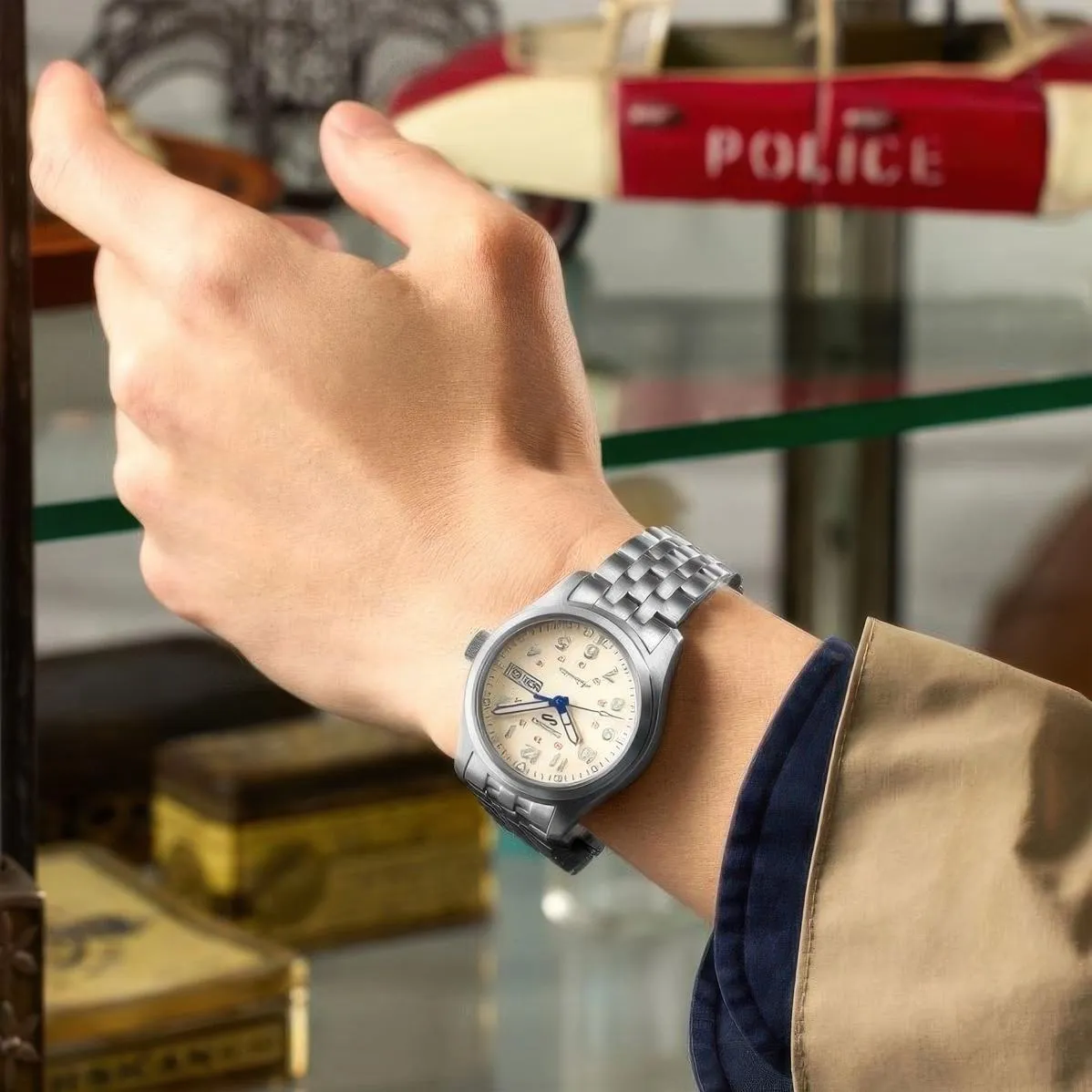 Мужские наручные часы Seiko Seiko 5 Sports SRPK41K1. Механические с ручным подзаводом. Браслет из нержавеющей стали. Браслет из нержавеющей стали. Прочное, устойчивое к царапинам минеральное стекло защищает часы от повреждений. На циферблате отображается текущее число месяца и день недели. Часы являются водонепроницаемыми до 10 Бар. Цвет циферблата: Серебристый. Цвет корпуса: Бежевый. На стрелки и отметки нанесен светонакопительный состав, благодаря этому считывать информацию с циферблата возможно и в темноте. Высота (с ушками): 48 мм. Толщина: 13 мм. Гарантия: 2 года.