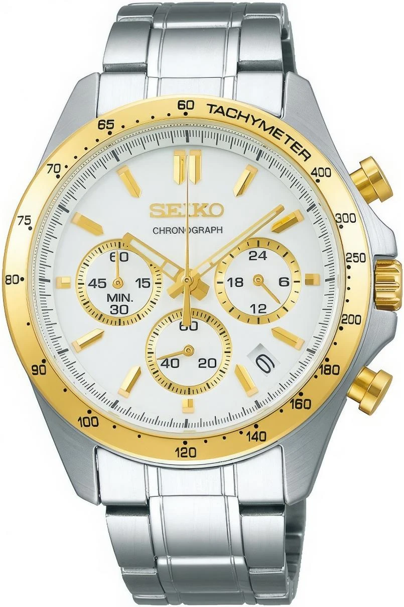 Мужские наручные часы Seiko Spirit SBTR024. Точный кварцевый механизм с аналоговой индикацией. Браслет из нержавеющей стали. Функция хронографа. Браслет из нержавеющей стали. Прочное, устойчивое к царапинам минеральное стекло защищает часы от повреждений. На циферблате отображается текущее число месяца. Часы являются водонепроницаемыми до 10 Бар. Цвет циферблата: Желтое золото. Цвет корпуса: Белый. На стрелки и отметки нанесен светонакопительный состав, благодаря этому считывать информацию с циферблата возможно и в темноте. Толщина: 12 мм. Гарантия: 2 года.