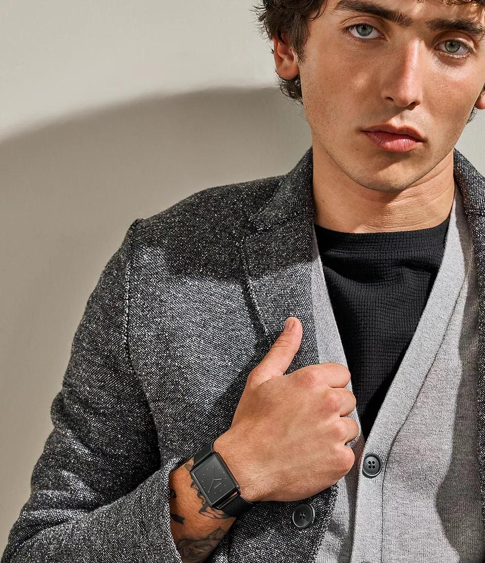 Мужские кварцевые часы с прямоугольным корпусом из стали с IP-покрытием. Лаконичный черный циферблат со штриховыми метками сочетается с элегантным стальным браслетом типа «Миланец». Модель оснащена минеральным стеклом и обладает водозащитой 5 ATM (50 метров). Габаритные размеры: диаметр 36 мм, толщина 7,7 мм, ширина ремешка 20 мм.
