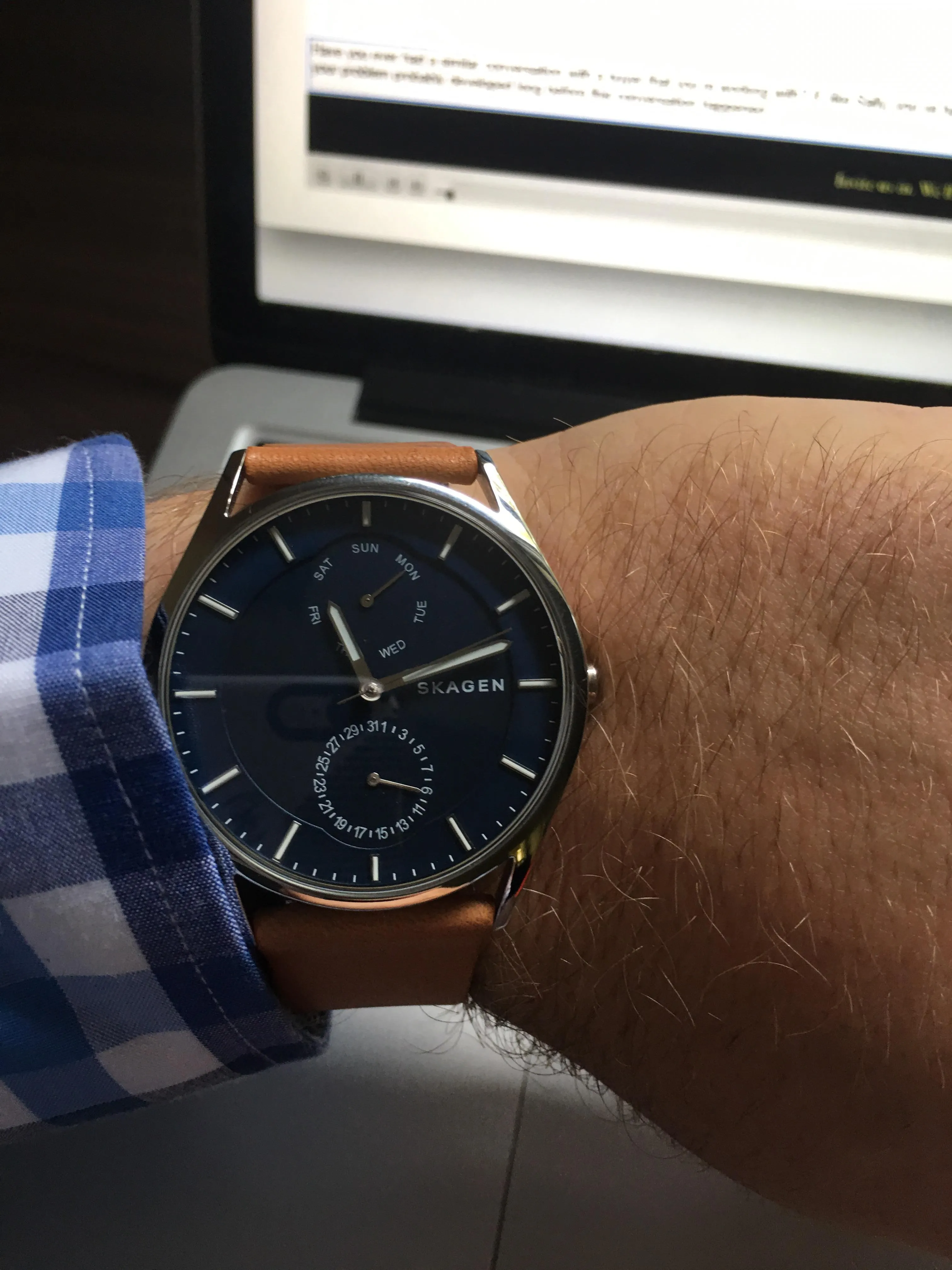Мужские наручные часы в круглом стальном корпусе со стрелочными указателями даты и дня недели. Минеральное стекло. Точный кварцевый механизм.