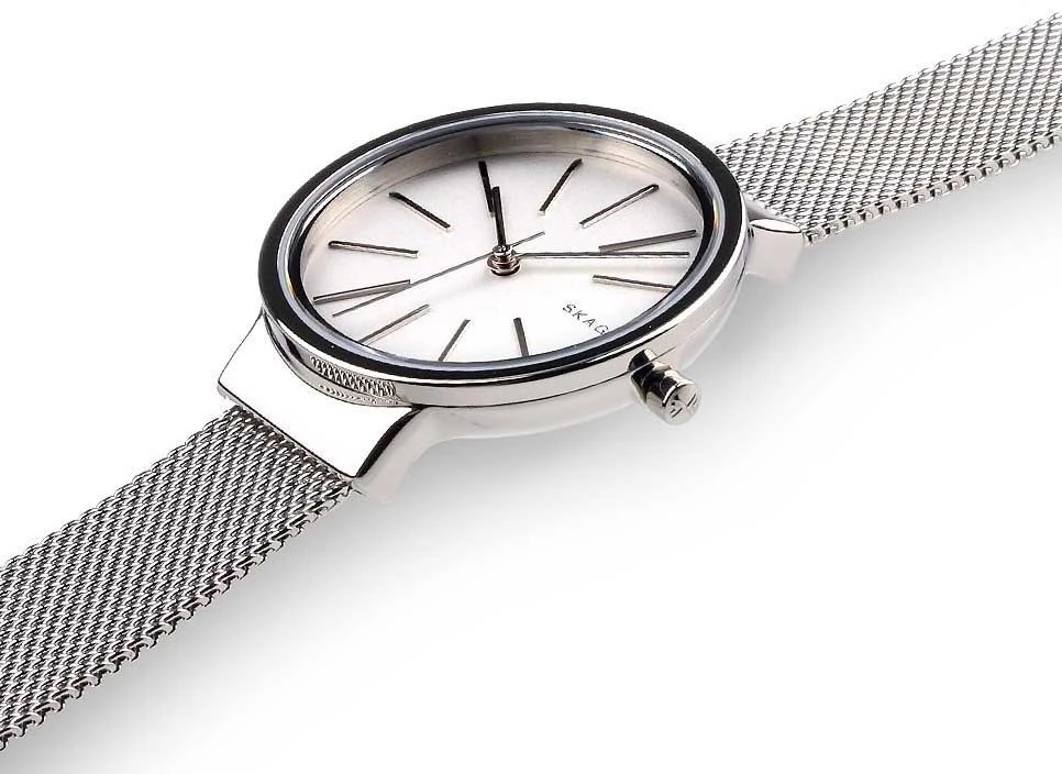 Женские наручные часы в стальном круглом корпусе на браслете миланского плетения. Вместо цифр риски. Минеральное стекло. Точный кварцевый механизм.