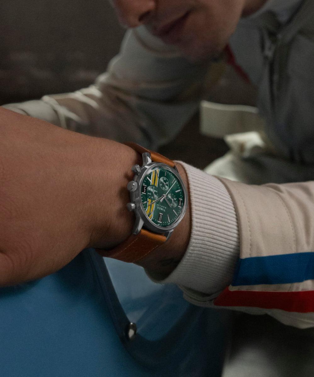 Яркая гоночная полоса освещает насыщенный зеленый циферблат этой прекрасно детализированной обновленной версии наших часов Marlin Quartz Chronograph Tachymeter. На отметке 3 часа вы найдете 24-часовой дополнительный циферблат, украшенный клетчатыми флагами, которые сигнализируют о победе на гоночной трассе. Эти гладкие часы, работающие на сверхточном кварцевом механизме, включают хронограф для отслеживания прошедшего времени и индекс тахиметра вдоль внешней минутной шкалы для измерения скорости. Хотя они привносят новую и захватывающую ноту в нашу коллекцию Marlin, они сохраняют классические черты Marlin с прочным 40-миллиметровым корпусом из нержавеющей стали, купольным акриловым стеклом и накладными индексами в стиле ретро в положении 3, 9 и 12 часов. Завершает гоночную эстетику перфорированный коричневый ремешок из натуральной кожи.