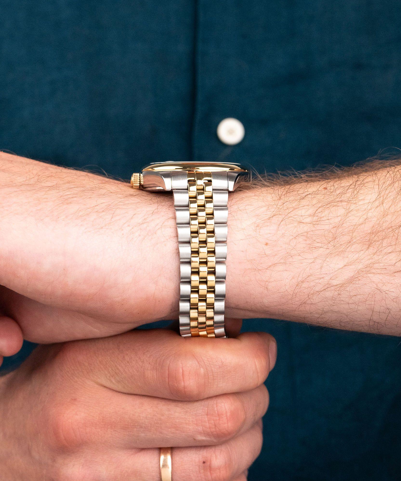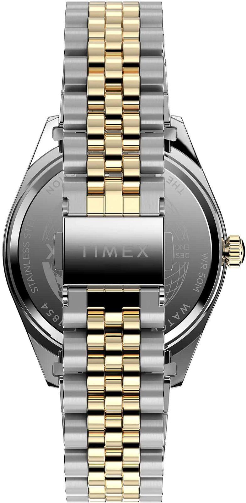 Эти часы покоряют своим великолепным дизайном: глубокий зеленый циферблат с эффектом солнечного сияния обрамлен золотистым безелем и корпусом из нержавеющей стали. Элегантности добавляют золотые стрелки и палочковые индексы, покрытые светящимся составом. Фирменный штрих модели — симметрично расположенные aperture дня недели на 12 часах и даты на 3 часах. Модель диаметром 41 мм оснащена кварцевым механизмом для точного хода, дополнена стильным двухцветным браслетом и обладает водонепроницаемостью 50 метров.