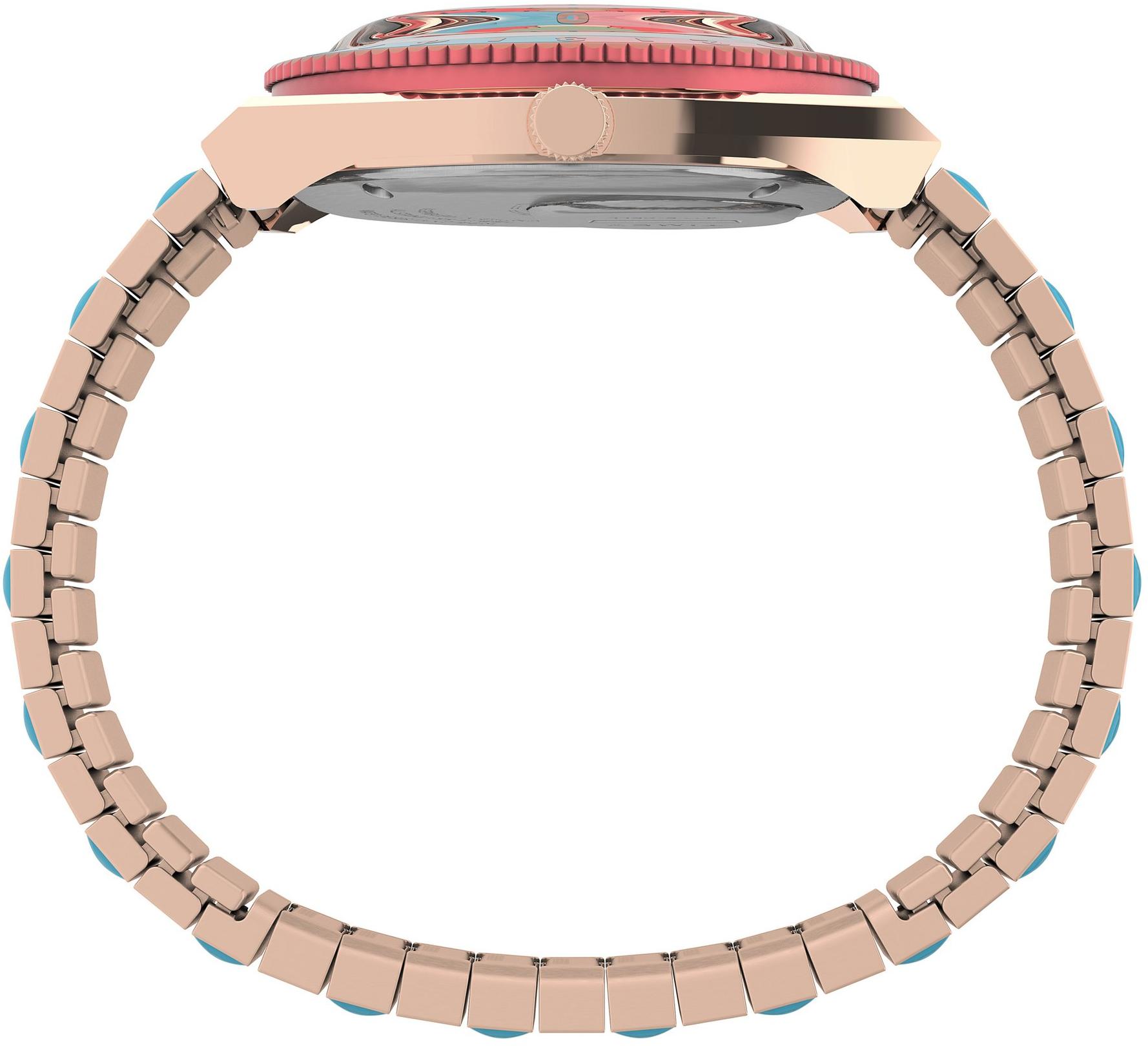 Женские кварцевые часы из серии Q Timex Malibu. Круглый стальной корпус с покрытием цвета золота. Вращающийся алюминиевый безель. Розовый циферблат. Пластиковое выпуклое стекло. WR 50 м. Стальной растягивающийся браслет с покрытием без застежки.