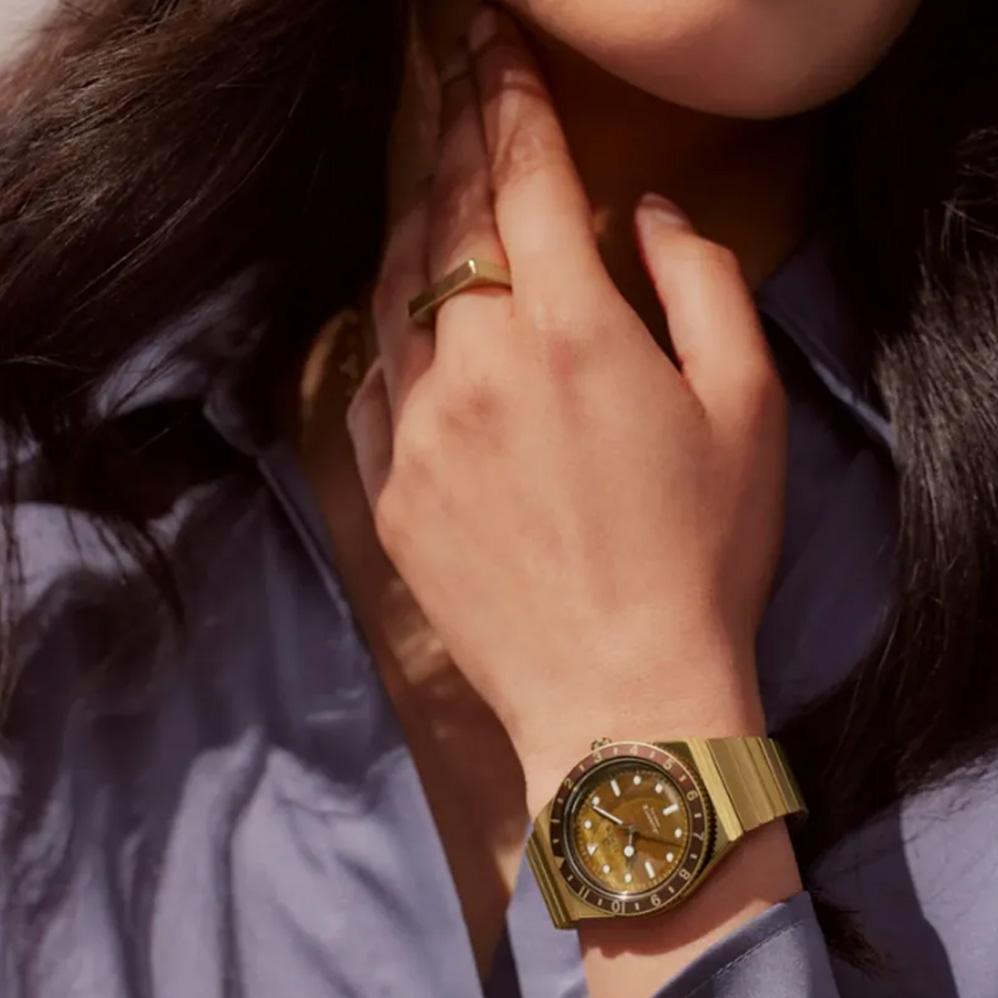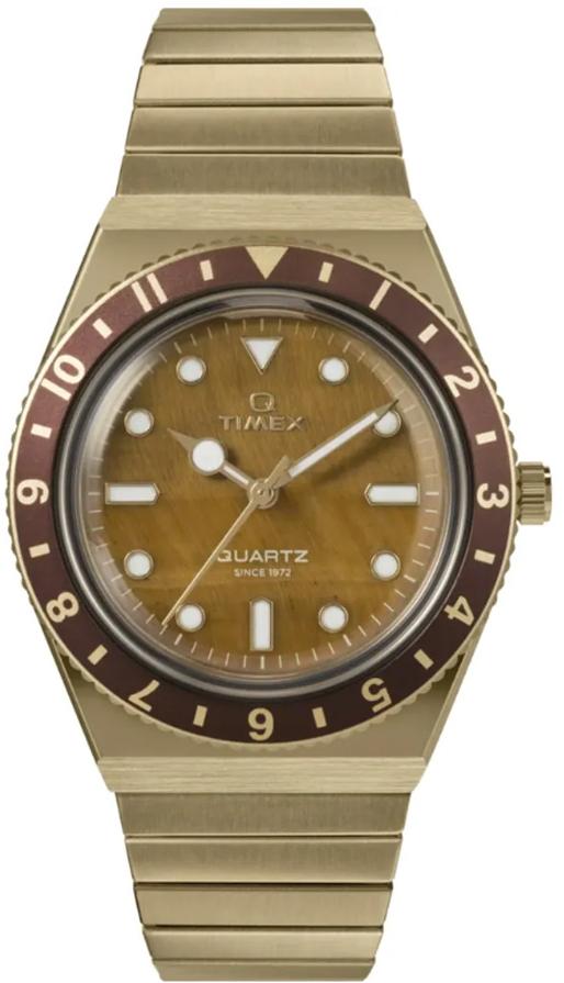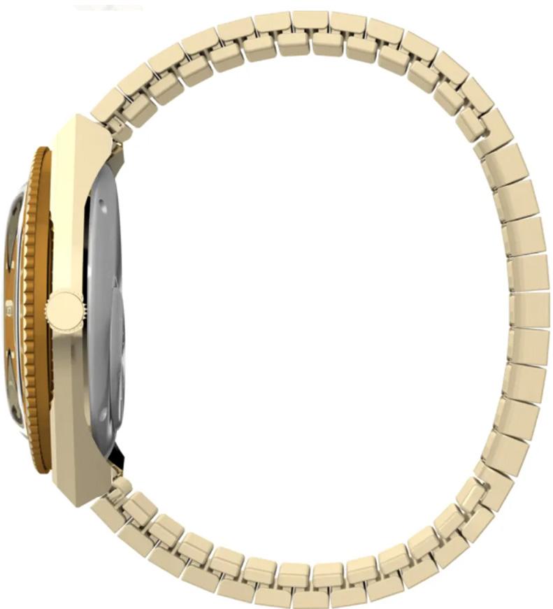 Корпус и браслет из нержавеющей стали золотистого оттенка. Вращающийся коричневый безель из нержавеющей стали. Коричневый циферблат «тигровый глаз» с золотистыми стрелками и часовыми метками. Тип циферблата: аналоговый. Кварцевый механизм. Минеральное стекло, устойчивое к царапинам. Заводная головка с выдвижным/нажимным механизмом. Цельная задняя крышка. Круглая форма корпуса, размер корпуса: 36 мм, толщина корпуса: 12 мм. Ширина ремешка: 16 мм. Расширительная застежка. Водонепроницаемость до 50 метров