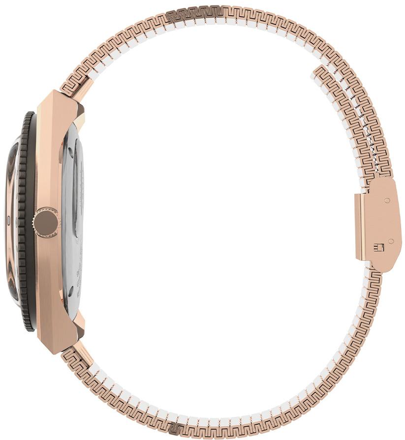 Женские наручные часы Timex Easy Reader TW2U95700. Точный кварцевый механизм с аналоговой индикацией. Корпус изготовлен из высококачественной нержавеющей стали 316L с высокими антикоррозийными свойствами. На стрелки и отметки нанесен светонакопительный состав, благодаря этому считывать информацию с циферблата возможно и в темноте. На циферблате отображается текущее число месяца и день недели. Браслет из нержавеющей стали. Прочное, устойчивое к царапинам минеральное стекло защищает часы от повреждений. Часы являются водонепроницаемыми до 5 Бар. Цвет корпуса: Розовое золото. Цвет циферблата: Бежевый. Ширина (с заводной головкой): 36мм. Толщина: 12мм. Гарантия: 2 года.
