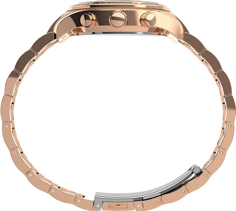 Женские наручные часы Timex Elevated Classics TW2V57900. Точный кварцевый механизм с аналоговой индикацией. Корпус изготовлен из высококачественной нержавеющей стали 316L с высокими антикоррозийными свойствами. На стрелки и отметки нанесен светонакопительный состав, благодаря этому считывать информацию с циферблата возможно и в темноте. На циферблате отображается текущее число месяца. Функция хронографа. Браслет из нержавеющей стали. Прочное, устойчивое к царапинам минеральное стекло защищает часы от повреждений. Часы являются водонепроницаемыми до 3 Бар. Цвет корпуса: Розовое золото. Цвет циферблата: Серебристый. Ширина (с заводной головкой): 38мм. Толщина: 12мм. Гарантия: 2 года.