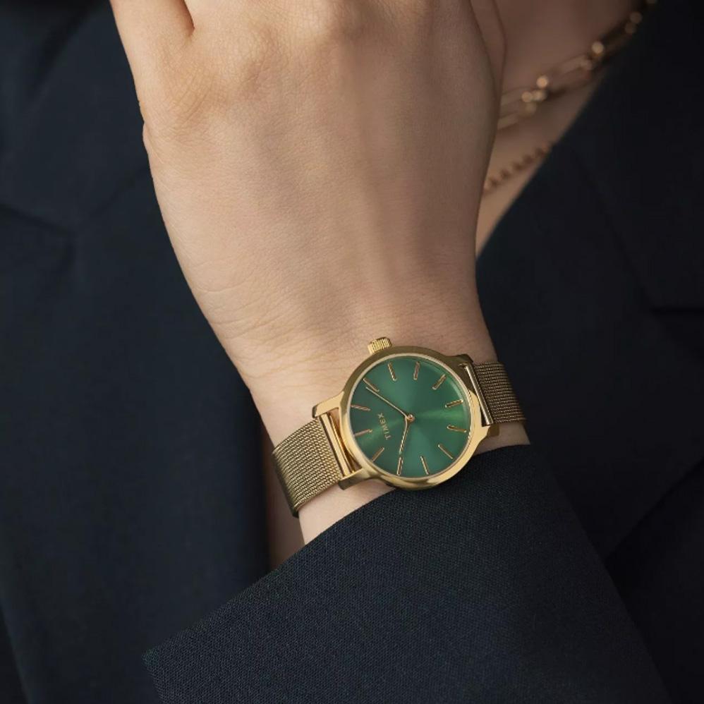 Тонкие часы Transcend с корпусом диаметром 31 мм, с роскошным изумрудным циферблатом с узором «солнечные лучи», полированным золотистым корпусом и элегантным сетчатым браслетом из нержавеющей стали золотистого цвета добавят изысканности вашему образу. Объемные метки на циферблате привлекут необходимое внимание к блестящему циферблату, создавая гармоничный образ, воплощающий сдержанный стиль и изысканность.