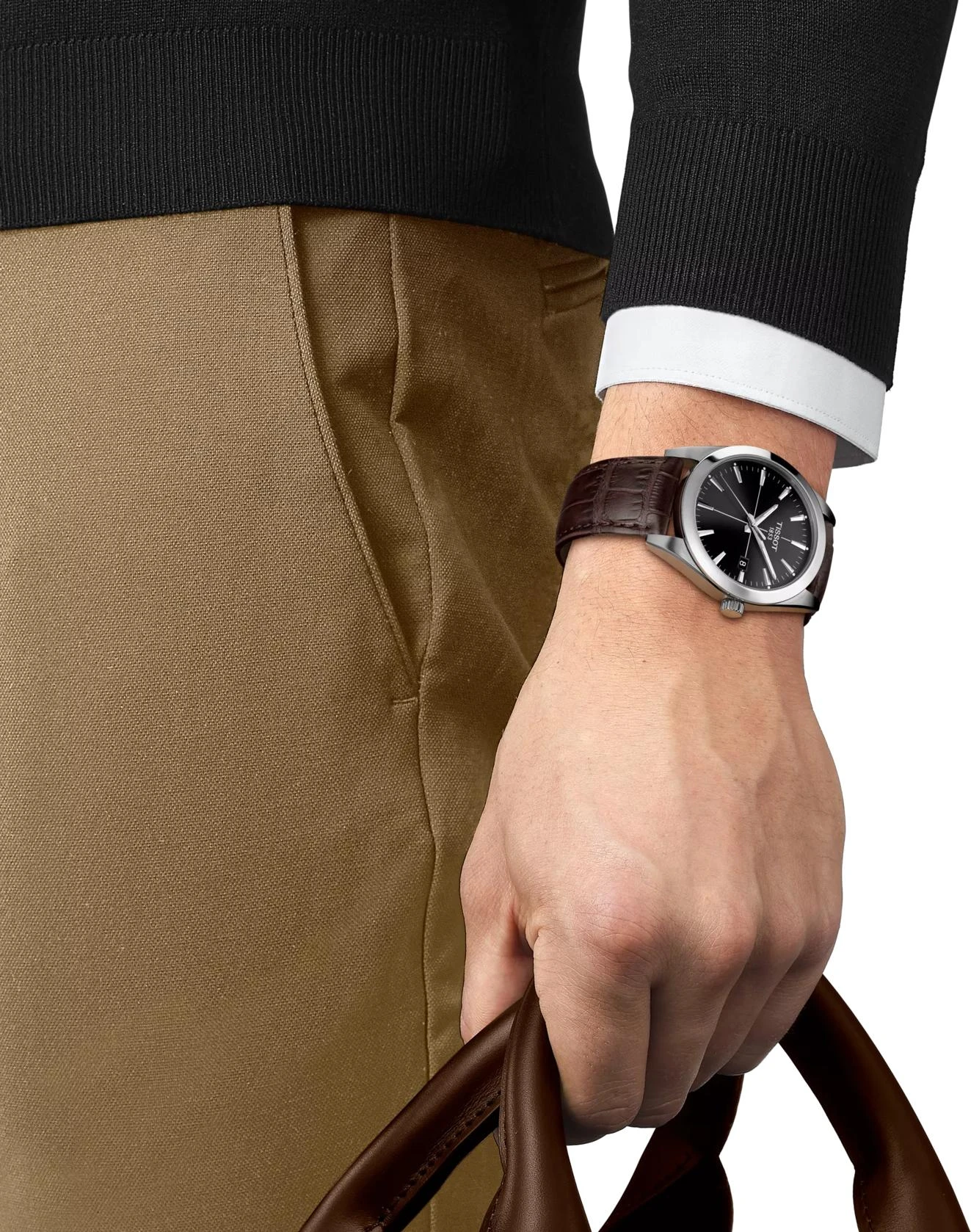 Надежные мужские часы Tissot Gentleman — это идеальный повседневный аксессуар, который подчеркнет ваш стиль. Элегантные и классические по дизайну, они великолепно сочетаются с любым образом. Механизм этих оригинальных часов — швейцарский кварц EOL, калибр 11 1/2''' (диаметр 25,6 мм) с функцией индикации окончания заряда батареи. Корпус круглой формы изготовлен из нержавеющей стали 316L, а защиту циферблата обеспечивает куполообразное сапфировое стекло, устойчивое к появлению царапин. Диаметр корпуса составляет 40 мм, толщина — 8,52 мм, а ширина между ушками — 21 мм. Вес часов — 70 г. Черный циферблат с индексами и люминесцентным покрытием Super-LumiNova на стрелках обеспечивает отличную читаемость. Швейцарские часы Tissot Gentleman оснащены ремешком из кожи коричневого цвета с застежкой-бабочкой с кнопками и системой быстрой замены. Модель имеет водонепроницаемость 100 метров (10 АТМ/bar): подходят для плавания и погружения на глубину 5–7 м (выдвигать заводную головку и нажимать кнопки, находясь в воде, нельзя).