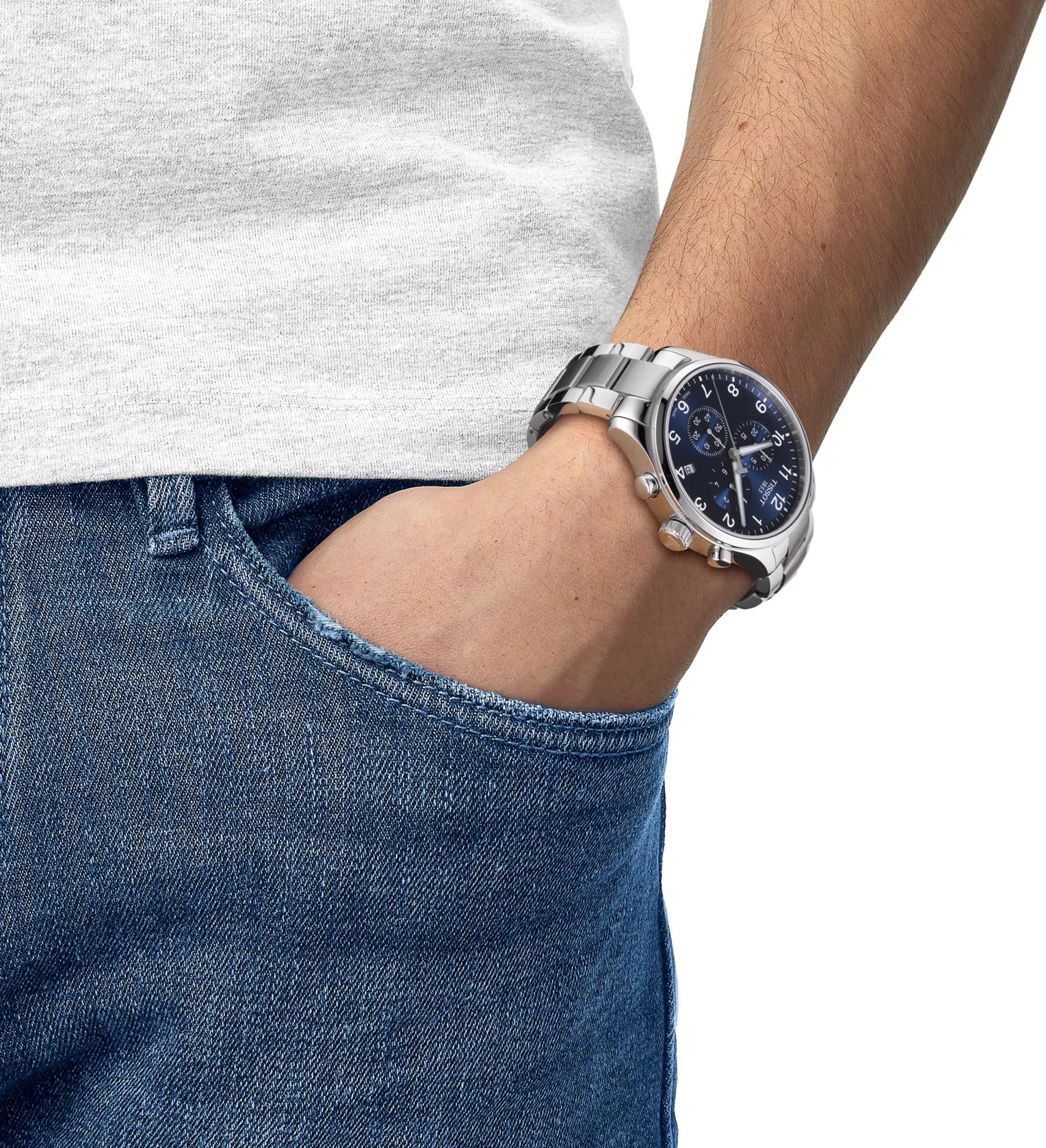 Приобретая Tissot Chrono XL Classic, вы выбираете оригинальные часы, сочетающие спортивный и элегантный стиль, а также швейцарские технологии. Эти мужские швейцарские часы являются одними из самых крупных хронографов в коллекции Tissot: их диаметр составляет 45 мм, а длина корпуса — 45 мм. Толщина корпуса — 11,02 мм, а ширина между ушками — 22 мм. Корпус круглой формы и браслет выполнены из нержавеющей стали 316L серого цвета. Вес изделия — 175 г. Циферблат синего цвета с арабскими индексами защищен устойчивым к появлению царапин сапфировым стеклом. Люминесцентный материал Super-LumiNova на стрелках обеспечивает считывание времени в темноте. Внутри установлен швейцарский кварцевый механизм с калибром 13 1/4''' и диаметром 29,8 мм, работающий от батарейки Renata 394, при этом имеется функция EOL (индикатор окончания заряда батарейки). Застежка — раскладная с кнопками. Хронограф оснащен функциями EOL, 30-минутным и 1/10-секундным счетчиками, центральной 60-секундной стрелкой хронографа, а также функциями ADD и SPLIT. Водозащита 100 метров (10 АТМ/bar): подходят для плавания и погружения на глубину 5-7 м (выдвигать заводную головку и нажимать кнопки, находясь в воде, нельзя).