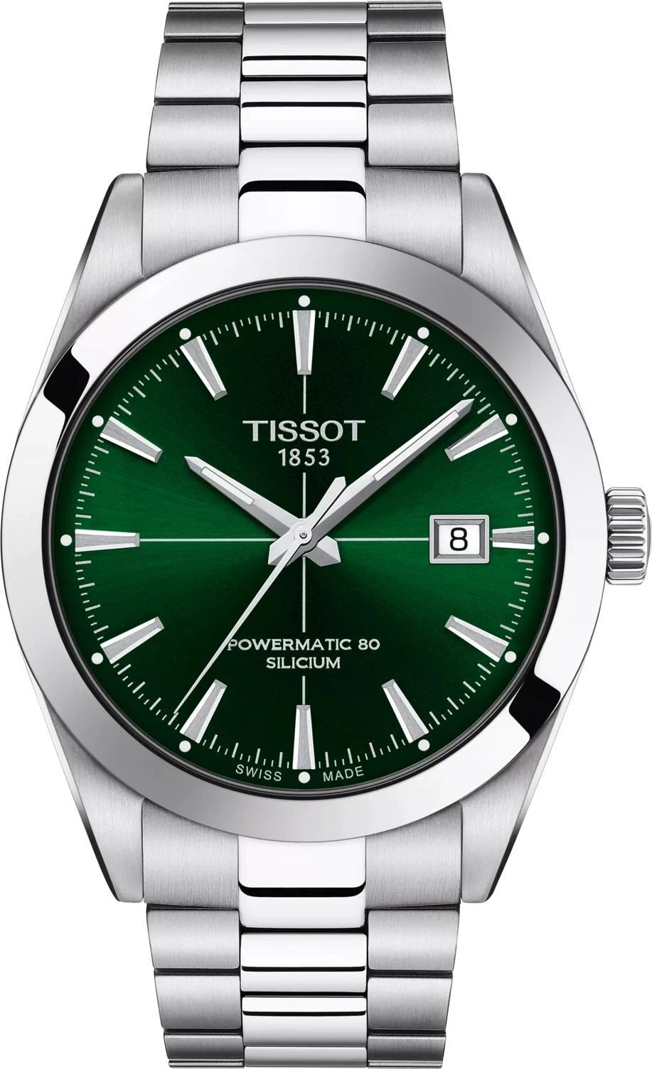Представляем вашему вниманию Tissot Gentleman Powermatic 80 Silicium — это идеальный стильный аксессуар на каждый день, который станет превосходным дополнением к любому образу. Эти мужские оригинальные часы обладают корпусом диаметром 40 мм и толщиной 11,5 мм, а их вес составляет 164 г. Круглый корпус выполнен из высококачественной нержавеющей стали 316L и имеет прозрачную заднюю крышку, открывающую вид на часовой механизм. Внутри установлен швейцарский автоматический механизм калибром 11 1/2''' (диаметр 25,6 мм) с запатентованной кремниевой пружиной баланса, который обеспечивает запас хода до 80 часов. Циферблат зеленого цвета с индексами защищен выпуклым устойчивым к царапинам сапфировым стеклом с антибликовым покрытием. На стрелках нанесен люминесцентный состав Super-LumiNova. Водозащита 100 метров (10 АТМ/bar): подходят для плавания и погружения на глубину 5-7 м (выдвигать заводную головку и нажимать кнопки, находясь в воде, нельзя). Элегантный серый браслет из нержавеющей стали оснащен застежкой-«бабочкой» с кнопками. Выбирая эти швейцарские часы, вы приобретаете безупречное качество и стиль.