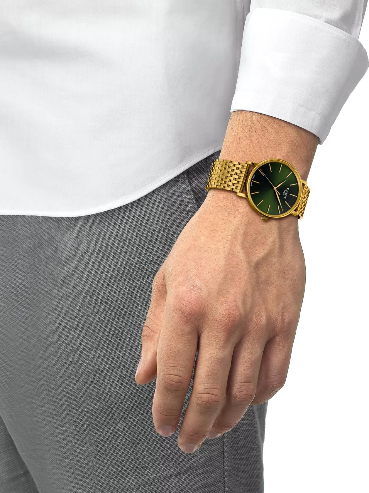 Ищете универсальный аксессуар, который будет уместен в любой ситуации? Оригинальные часы Tissot Everytime 40mm — идеальный выбор для современного мужчины. Эта модель является воплощением швейцарского мастерства, отличаясь минималистичным, чистым и вневременным дизайном, благодаря чему она подойдет к любому образу и стилю жизни. Надежные швейцарские часы оснащены точным кварцевым механизмом с калибром 11 1/2''' и функцией EOL (индикатор окончания срока службы батареи), работающим от батареи типа Renata 371. Круглый корпус часов диаметром 40 мм и толщиной 7,07 мм выполнен из нержавеющей стали 316L с PVD-покрытием цвета желтого золота, что придает им изысканный вид. Циферблат привлекательного зеленого цвета защищен устойчивым к царапинам сапфировым стеклом. Вес изделия составляет 112 г. Водонепроницаемость 50 метров (5 АТМ/bar): часы выдерживают мытье рук, попадание крупных капель. Модель комплектуется сменным быстросъемным браслетом из нержавеющей стали с PVD-покрытием цвета желтого золота, оснащенным застежкой-бабочкой с кнопками.