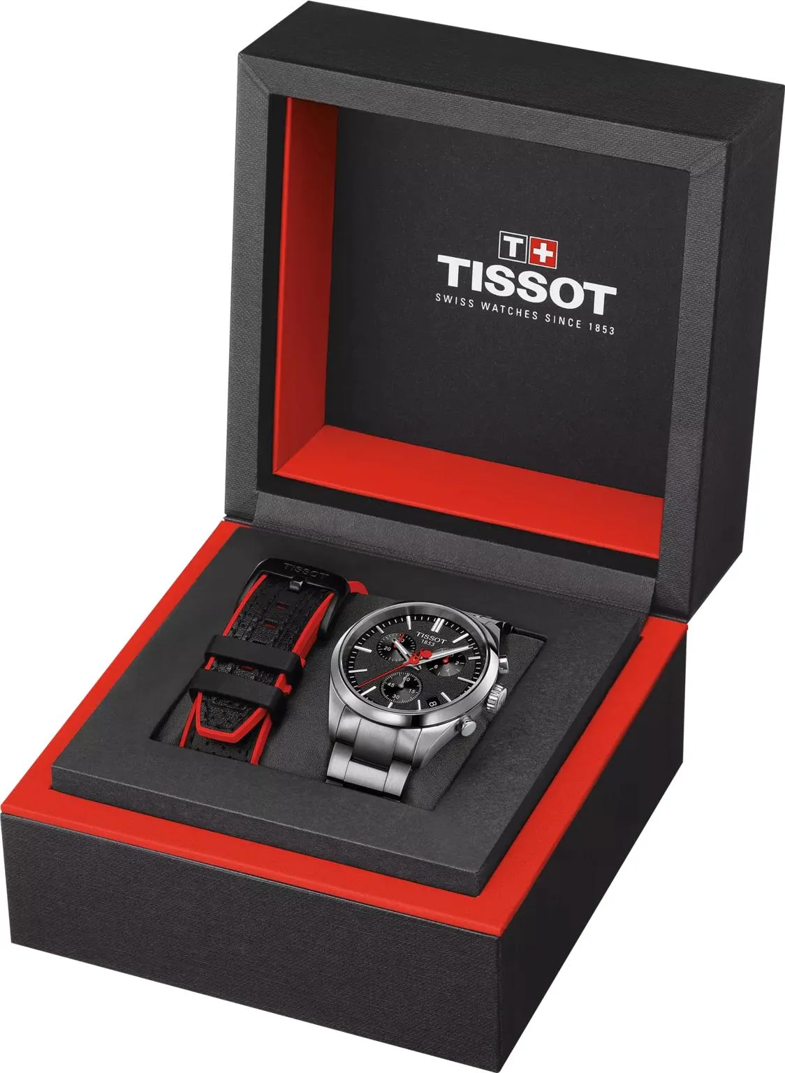 Встречайте мужские оригинальные часы Tissot PR 100 Vuelta, выпущенные специальной серией, которые призваны подчеркнуть вашу индивидуальность и страсть к велоспорту. Корпус этих швейцарских часов выполнен из устойчивой к износу нержавеющей стали 316L, гарантируя долговечность и сохранение привлекательности даже в самых напряженных условиях. Размеры корпуса составляют 40x40 мм, толщина — 11,26 мм, а вес — 135 г. Циферблат черного цвета украшен тематическим зернистым рисунком, напоминающим асфальтовое покрытие, отражая дорогу под колесами велогонщиков. Дизайн дополнен красной секундной стрелкой, выполненной в форме велосипеда, символизирующей La Vuelta, а черное окошко даты органично вписывается в общую эстетику. Часы оснащены точным и надежным кварцевым механизмом G10.212 с функциями EOL (индикатором окончания заряда батареи), 30-минутным и 1/10-секундным счетчиками, центральной 60-секундной стрелкой хронографа, а также функциями ADD и SPLIT. Диаметр калибра составляет 29,8 мм, а запас энергии обеспечивает батарея Renata 394. От царапин циферблат защищает сапфировое стекло. Видимость в условиях низкой освещенности гарантирована благодаря покрытию Super-LumiNova на стрелках. Задняя крышка этой модели Grand Tour PR100 украшена гравировкой логотипа La Vuelta, подчеркивая эксклюзивность. Часы обладают водонепроницаемостью до 100 метров (10 АТМ/bar): подходят для плавания и погружения на глубину 5–7 м (выдвигать заводную головку и нажимать кнопки, находясь в воде, нельзя). Универсальность PR100 усиливается за счет трехрядного браслета из нержавеющей стали серого цвета с застежкой-бабочкой с кнопками и возможностью быстрой замены.