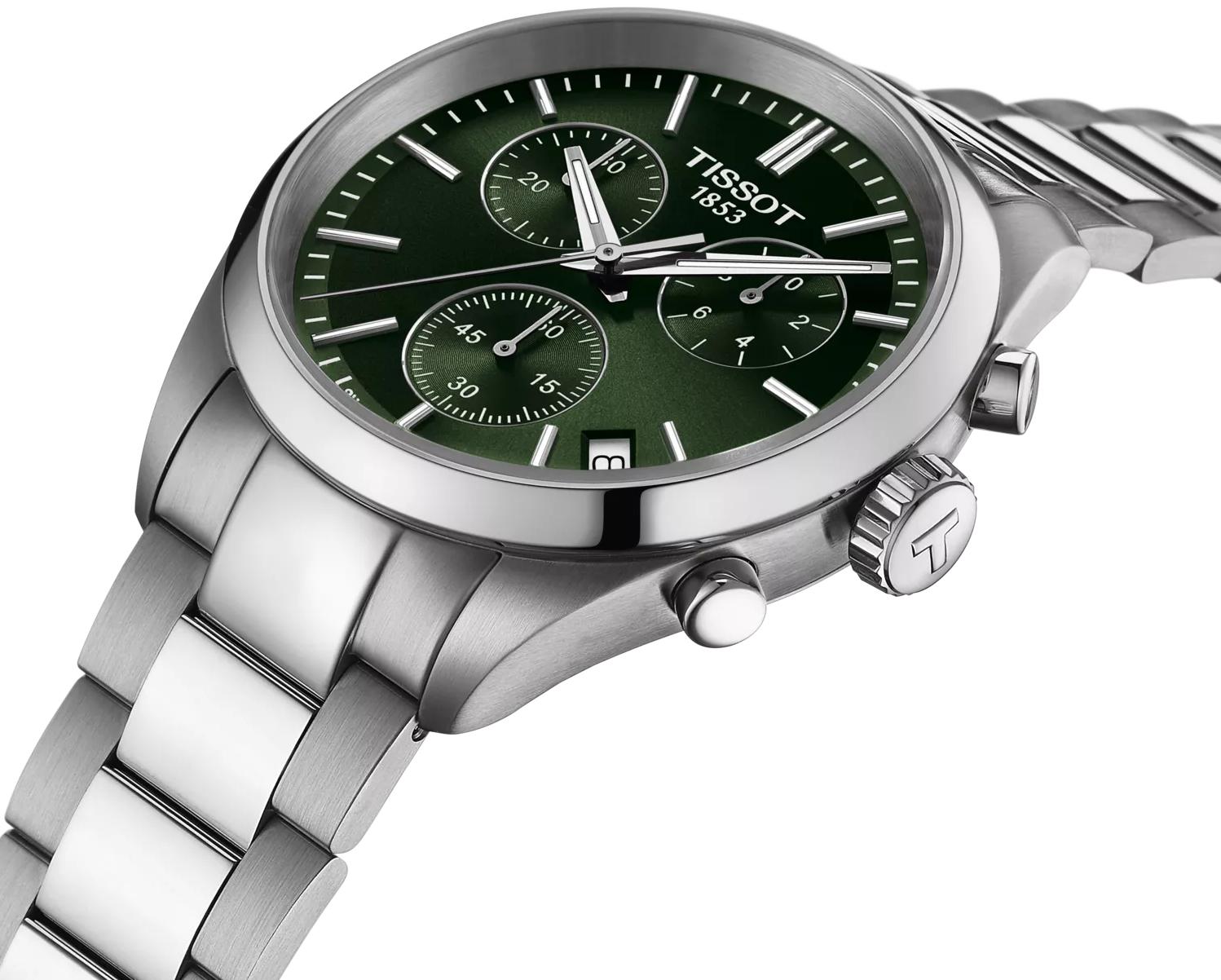 Встречайте Tissot PR 100 Chronograph — идеальные мужские часы для тех, кто ценит сочетание спортивного стиля и классической элегантности. Эти оригинальные часы станут надежным аксессуаром на каждый день, подчеркивая ваш безупречный вкус. Коллекция PR100 предлагает классические кварцевые хронографы в различных цветах. Эти спортивные, но в то же время стильные часы отличаются полированным центральным рядом на браслете для более блестящего вида, белым диском в окошке даты и стандартной секундной стрелкой. Точность и прочность обеспечивает хронокварцевый механизм G10.212, дополненный водонепроницаемостью до 10 бар (100 метров / 330 футов), а видимость в условиях недостаточной освещенности гарантирована покрытием Super-LumiNova на стреловидных стрелках. Модель оснащена швейцарским кварцевым механизмом с индикатором заряда батареи EOL (End-of-Life), калибр которого составляет 13 1/4''' и имеет диаметр 29,8 мм. Функционал включает в себя 30-минутный и 1/10-секундный счетчики, центральную 60-секундную стрелку хронографа, а также функции ADD и SPLIT. Корпус часов круглой формы изготовлен из нержавеющей стали 316L, его длина и ширина составляют 40 мм, а толщина — 11,26 мм. Вес часов — 135 г. Циферблат зеленого цвета с индексами и люминесцентным покрытием Super-LumiNova на стрелках защищен устойчивым к царапинам сапфировым стеклом. Водонепроницаемость 100 метров (10 АТМ/bar): подходят для плавания и погружения на глубину 5-7 м (выдвигать заводную головку и нажимать кнопки, находясь в воде, нельзя). Браслет из нержавеющей стали серого цвета оснащен застежкой-бабочкой с кнопками.