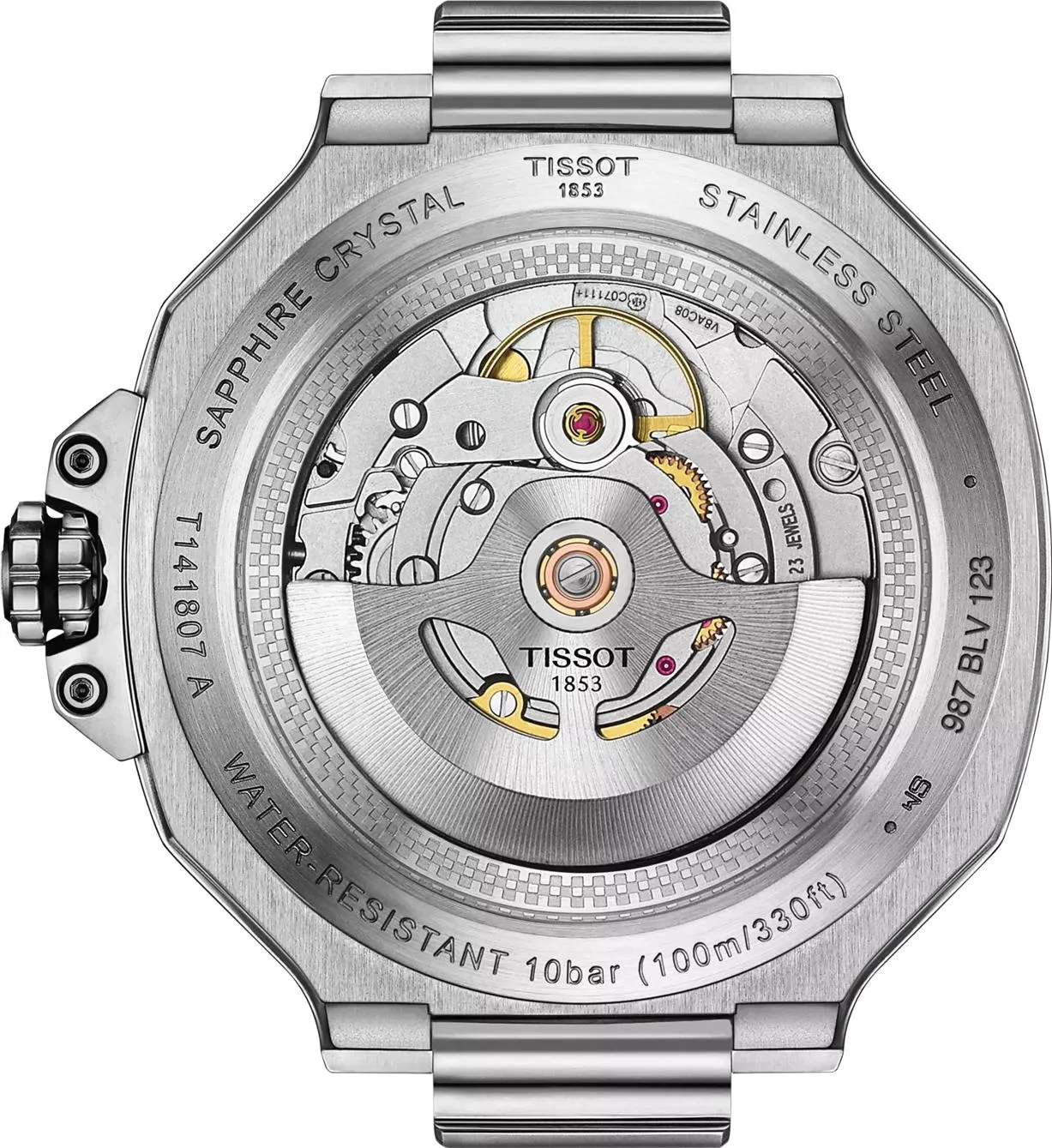 Представляем мужские оригинальные часы Tissot T-Race Powermatic 80 41mm — эти модели воплощают нечто большее, чем просто средство измерения времени, они отражают стиль жизни и страсть к мотогонкам, что могут продемонстрировать все владельцы с коллекцией T-Race. Сквозная задняя крышка открывает вид на сердце точного часового механизма: оснащенные калибром Powermatic 80 с балансирной пружиной Nivachron, автоматические часы T-Race переосмысливают границы возможного. Безель и защита заводной головки вдохновлены тормозным диском и суппортом, что позволяет получить ощущение от вождения, в котором органично сочетаются страсть к автоспорту и инновации. Корпус этих швейцарских часов выполнен из высококачественной нержавеющей стали 316L круглой формы, его ширина и длина составляют 41 мм, а толщина — 11,28 мм. Модель оснащена устойчивым к появлению царапин сапфировым стеклом с антибликовым покрытием, защищающим синий циферблат с индексами. На стрелках используется люминесцентное покрытие Super-LumiNova. Запас хода автоматического механизма калибра 11 1/2''' с диаметром 25,6 мм составляет до 80 часов. Дополнительно механизм оснащен запатентованной балансирной пружиной Nivachron. Часы имеют водонепроницаемость 100 метров (10 АТМ/bar): подходят для плавания и погружения на глубину 5-7 м (выдвигать заводную головку и нажимать кнопки, находясь в воде, нельзя). Общий вес изделия — 185 г, оно дополнено браслетом из нержавеющей стали серого цвета с раскладной застежкой с системой блокировки и кнопками.