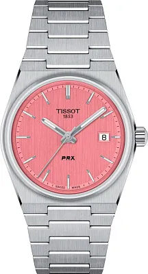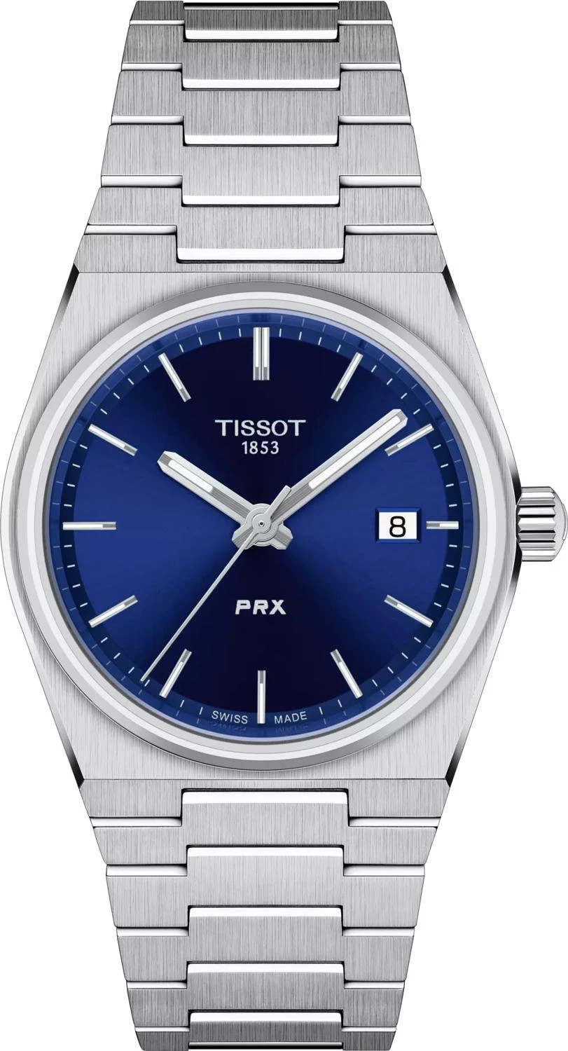 Представляем вашему вниманию оригинальные часы Tissot PRX 35mm Quartz с артикулом T137.210.11.041.00 — переиздание легендарной модели 1978 года, сочетающее в себе изысканный ретро-стиль и современные технологии для тех, кто ценит дизайн и изобретательность. Корпус имеет элегантную форму «бочки» (Tonneau shape) с габаритами 34,6 на 35 мм и толщиной 9,6 мм, выполнен из нержавеющей стали 316L, известной своей прочностью и гипоаллергенными свойствами. Эти женские часы оснащены надежным швейцарским кварцевым механизмом с калибром 10 1/2''' и диаметром 23,3 мм, работающим от батареи типа Renata 371 и имеющим функцию EOL (индикатор окончания заряда батареи). Красивый синий циферблат с индексами защищен устойчивым к царапинам сапфировым стеклом, а стрелки покрыты люминесцентным составом Super-LumiNova для идеальной читаемости в любое время суток. Модель обладает водонепроницаемостью до 10 бар (100 м), что означает, что эти швейцарские часы подходят для плавания и погружения на глубину 5–7 м (выдвигать заводную головку и нажимать кнопки, находясь в воде, нельзя). Тонкий и сужающийся корпус в сочетании с эргономичным интегрированным браслетом из нержавеющей стали серого цвета делают PRX идеальным аксессуаром, который моментально приковывает взгляды. Браслет, оснащенный застежкой-бабочкой с кнопками, имеет ширину ушек 11 мм и систему быстрой замены. Вес часов составляет всего 97 граммов.