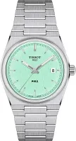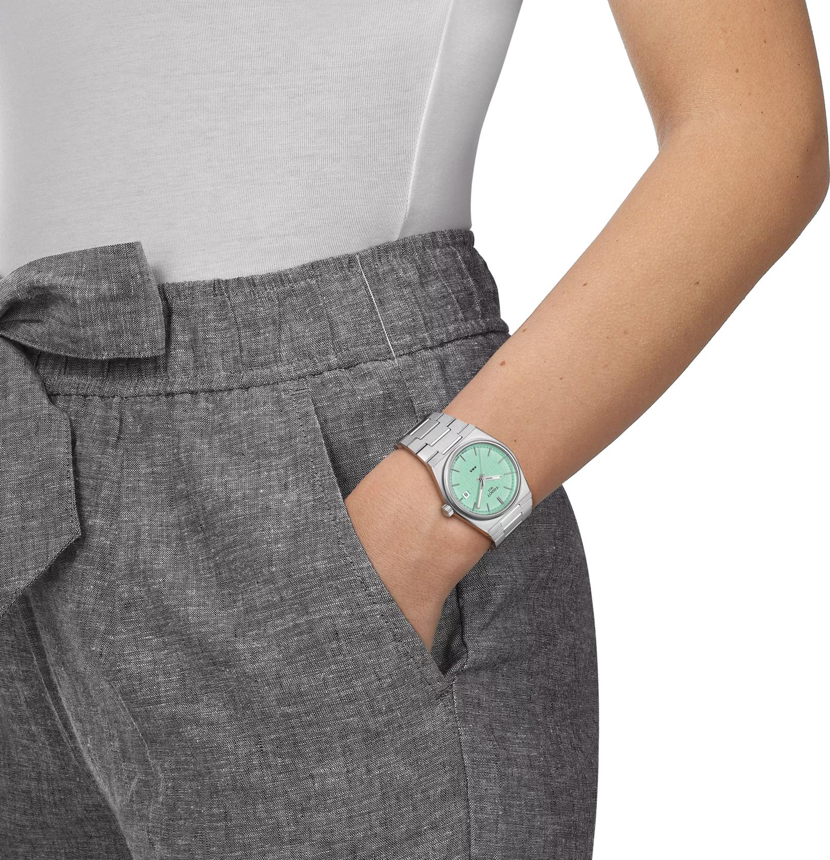 Почувствуйте ностальгию и современную элегантность с оригинальными часами Tissot PRX 35mm Quartz, артикул T137.210.11.091.00 — моделью, вдохновленной легендарным дизайном 1978 года. Эти женские часы являются идеальным выбором для тех, кто ценит утонченный ретростиль и смелый дизайн, ведь они полностью повторяют точный размер своего предшественника — 35 мм в диаметре. Тонкий корпус бочкообразной формы, выполненный из высококачественной нержавеющей стали 316L, плавно переходит в эргономичный интегрированный браслет стального цвета с удобной застежкой-бабочкой с кнопками и возможностью быстрой замены, что делает эту модель одновременно знаковой и современной. Швейцарские часы оснащены надежным кварцевым механизмом (калибр 10 1/2''' или 23.3 мм) с функцией EOL, указывающей на окончание срока службы батареи типа Renata 371. Вес изделия составляет 97 г, а его габариты — длина 34.6 мм, ширина 35 мм и толщина 9.6 мм. Яркий светло-зеленый циферблат с индексами защищен устойчивым к царапинам сапфировым стеклом, а для лучшей читаемости в темноте на стрелки нанесен люминесцентный состав Super-LumiNova. Защита от воды у этой модели составляет 100 метров (10 АТМ/bar): они подходят для плавания и погружения на глубину 5–7 м (выдвигать заводную головку и нажимать кнопки, находясь в воде, нельзя).