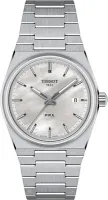 Откройте для себя очарование вневременного ретродизайна с моделью Tissot PRX 35mm, артикул T137.210.11.111.00 — эти оригинальные часы, впервые представленные в 1978 году, триумфально возвращаются, чтобы покорить ценителей изобретательности и изысканного стиля. Швейцарские часы Tissot PRX созданы для тех, кто страстно любит дизайн: тонкий, сужающийся к краю корпус бочкообразной формы и эргономичный интегрированный браслет из нержавеющей стали 316L объединяют легендарное прошлое и современную утонченность, делая аксессуар актуальным для людей всех возрастов. Эти женские часы имеют диаметр 35 мм, что в точности соответствует размеру оригинальной модели 1978 года. Внутри корпуса, толщина которого составляет 9,6 мм, а высота — 34,6 мм, находится швейцарский кварцевый механизм с калибром 10 1/2''' и функцией EOL (индикатор низкого заряда батареи), работающий от элемента питания Renata 371. Белый перламутровый циферблат с индексами защищен устойчивым к появлению царапин сапфировым стеклом, а для лучшей читаемости в темноте на стрелки нанесено люминесцентное покрытие Super-LumiNova. Модель весом 97 г оснащена стальным браслетом серого цвета со сменным креплением. Водонепроницаемость составляет 100 метров (10 АТМ/bar): подходят для плавания и погружения на глубину 5–7 м (выдвигать заводную головку и нажимать кнопки, находясь в воде, нельзя).
