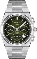 Приобретите для себя или в подарок эти великолепные мужские часы Tissot PRX Automatic Chronograph 42mm — настоящие оригинальные часы, сочетающие узнаваемый угловатый корпус Tissot 1978 года с современными характеристиками и ставшие обязательным приобретением в списке желаний каждого ценителя. Корпус шириной 42 мм и длиной 41,5 мм, выполненный из нержавеющей стали 316L, имеет форму «бочка» и сатинированную отделку, что, вместе с циферблатом градиентного зеленого цвета с индексами, подчеркивает непринужденный стиль спортивных часов 1970-х годов. Толщина корпуса составляет 14,54 мм, а его задняя крышка выполнена прозрачной. Вес этой модели — 184 г. Эти швейцарские часы работают благодаря автоматическому хронографу Valjoux A05.H31 с калибром 13 1/4''' (диаметр 30 мм), который обеспечивает классическое расположение счетчиков хронографа на 3, 6 и 9 часах. Механизм имеет патентованную пружину баланса Nivachron и запас хода до 68 часов, а его функции включают 12-часовой, 30-минутный и 60-секундный счетчики, а также центральную 60-секундную стрелку хронографа. Защиту циферблата обеспечивает устойчивое к появлению царапин сапфировое стекло с антибликовым покрытием, а на стрелки нанесено люминесцентное покрытие Super-LumiNova. Браслет из нержавеющей стали серого цвета, который легко снимается благодаря системе быстрой замены, а застежка — раскладная с кнопками, тип «бабочка». Водонепроницаемость этих часов составляет 100 метров (10 АТМ/bar): они подходят для плавания и погружения на глубину 5–7 м (выдвигать заводную головку и нажимать кнопки, находясь в воде, нельзя).