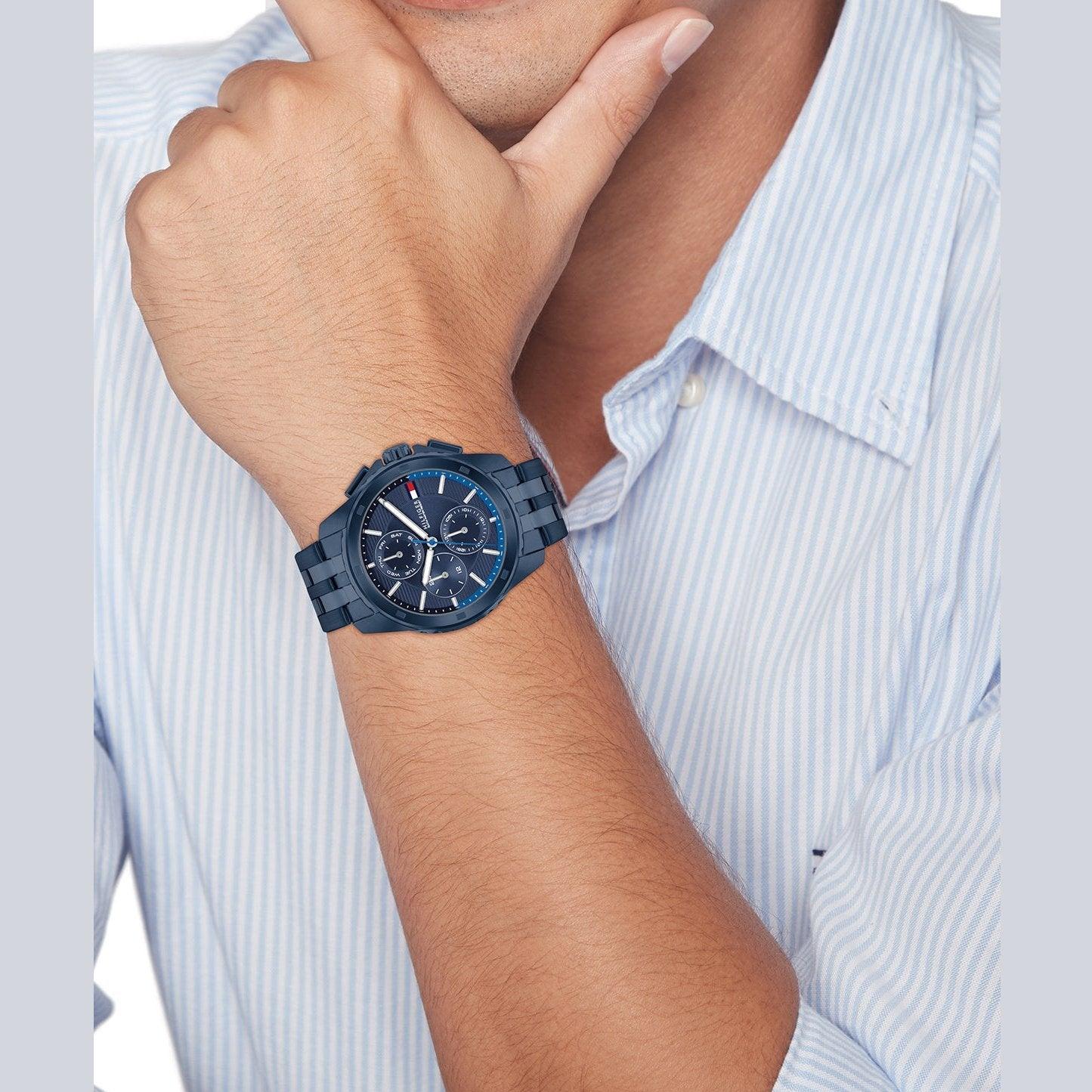 Мужские многофункциональные часы Tommy Hilfiger 1710622 сочетают в себе передовые технологии и утонченный стиль. Модель с точным кварцевым механизмом заключена в прочный корпус диаметром 44 мм с износостойким ионным синим покрытием Ionic Blue 2. Темно-синий циферблат и синий стальной браслет с ионным покрытием создают гармоничный элегантный образ. Благодаря водонепроницаемости 5 АТМ и удобной кнопочной застежке часы идеально подходят для активного образа жизни и повседневного ношения. Многофункциональные возможности и продуманный дизайн делают эту модель стильным аксессуаром для современного мужчины, ценящего надежность и выразительную эстетику.