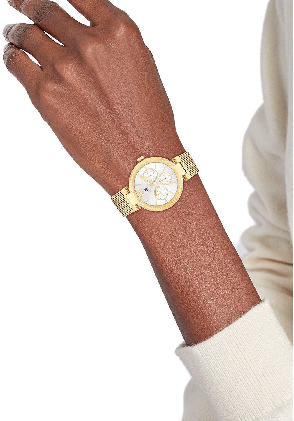 Женские часы Tommy Hilfiger 1782694 с многофункциональным кварцевым механизмом станут изысканным дополнением вашего образа. Элегантный 36-миллиметровый корпус толщиной 8,3 мм с покрытием из желтого золота гармонично сочетается со светлым циферблатом и стальным браслетом шириной 18,1 мм, обеспечивающим комфортную посадку. Прочное минеральное стекло защищает от царапин, а водонепроницаемость 3 бара (30 метров) позволяет не снимать часы при мытье рук или во время дождя. Удобная скользящая застежка-пряжка и универсальный дизайн делают эту модель идеальным аксессуаром как для повседневной носки, так и для особых мероприятий.