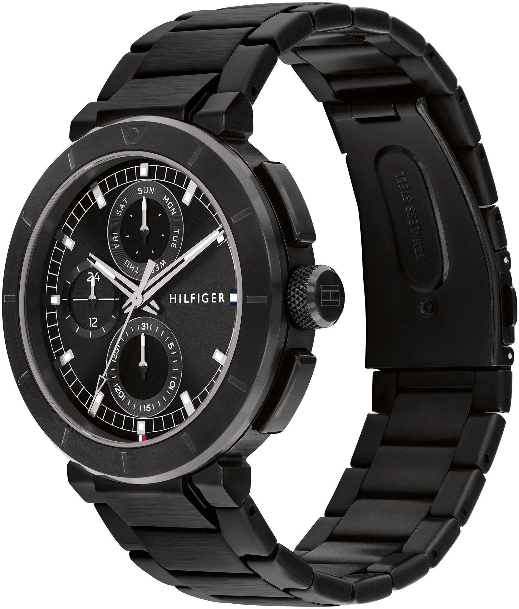 Мужские многофункциональные часы Tommy Hilfiger 1792119 — это гармония инновационных технологий и бескомпромиссного стиля. Модель с 44-миллиметровым корпусом в ионном черном покрытии оснащена точным кварцевым механизмом и многофункциональными осложнениями. Глубокий черный циферблат, защищенный минеральным стеклом, сочетается с 14-миллиметровым браслетом, создавая целостный эстетический образ. Благодаря водонепроницаемости 5 АТМ часы устойчивы к воздействию влаги, а раскладывающаяся застежка с кнопкой гарантирует идеальную посадку на запястье. Этот аксессуар для тех, кто ценит лаконичную роскошь и готов подчеркнуть свой статус в деловой встрече, вечернем выходе или повседневной жизни.
