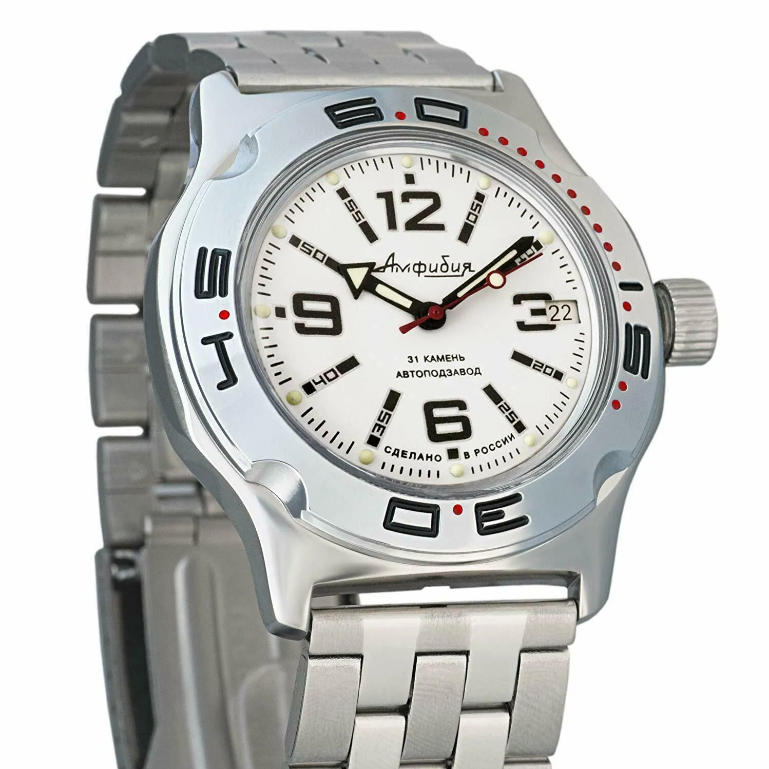Мужские наручные часы Восток Амфибия 100485. Автоматические с ручным подзаводом. Пружина механизма заводится автоматически благодаря естественным движениям владельца в процессе ежедневной носки часов. Также есть возможность ручного завода. Корпус изготовлен из высококачественной нержавеющей стали 316L с высокими антикоррозийными свойствами. На стрелки и отметки нанесен светонакопительный состав, благодаря этому считывать информацию с циферблата возможно и в темноте. На циферблате отображается текущее число месяца. Браслет из нержавеющей стали. Органическое стекло. Часы являются водонепроницаемыми до 20 Бар. Цвет корпуса: Белый. Цвет циферблата: Белый. Ширина (с заводной головкой): 42мм. Толщина: 15мм. Гарантия: 1 год.