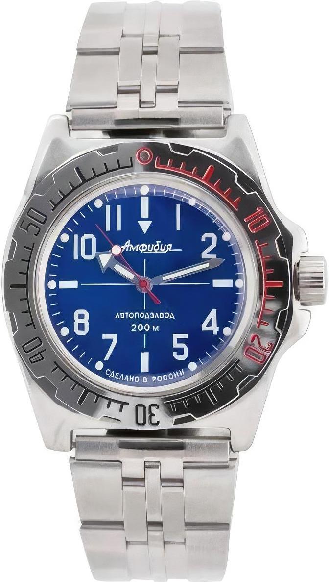 Мужские наручные часы Восток Амфибия 110648. Автоматические с ручным подзаводом. Пружина механизма заводится автоматически благодаря естественным движениям владельца в процессе ежедневной носки часов. Также есть возможность ручного завода. Корпус изготовлен из высококачественной нержавеющей стали 316L с высокими антикоррозийными свойствами. На стрелки и отметки нанесен светонакопительный состав, благодаря этому считывать информацию с циферблата возможно и в темноте. Браслет из нержавеющей стали. Органическое стекло. Часы являются водонепроницаемыми до 20 Бар. Цвет корпуса: Синий. Цвет циферблата: Синий. Ширина (с заводной головкой): 42мм. Толщина: 13мм. Гарантия: 1 год.