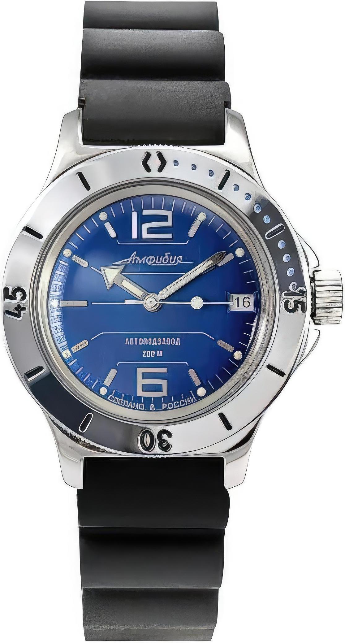 Мужские наручные часы Восток Амфибия 120696. Механические с автоподзаводом. Пружина механизма заводится автоматически благодаря естественным движениям владельца в процессе ежедневной носки часов. Корпус изготовлен из высококачественной нержавеющей стали 316L с высокими антикоррозийными свойствами. На стрелки и отметки нанесен светонакопительный состав, благодаря этому считывать информацию с циферблата возможно и в темноте. На циферблате отображается текущее число месяца. Ремешок изготовлен из каучука. Органическое стекло. Часы являются водонепроницаемыми до 20 Бар. Цвет корпуса: Синий. Цвет циферблата: Синий. Ширина (с заводной головкой): 46мм. Толщина: 13мм. Гарантия: 1 год.