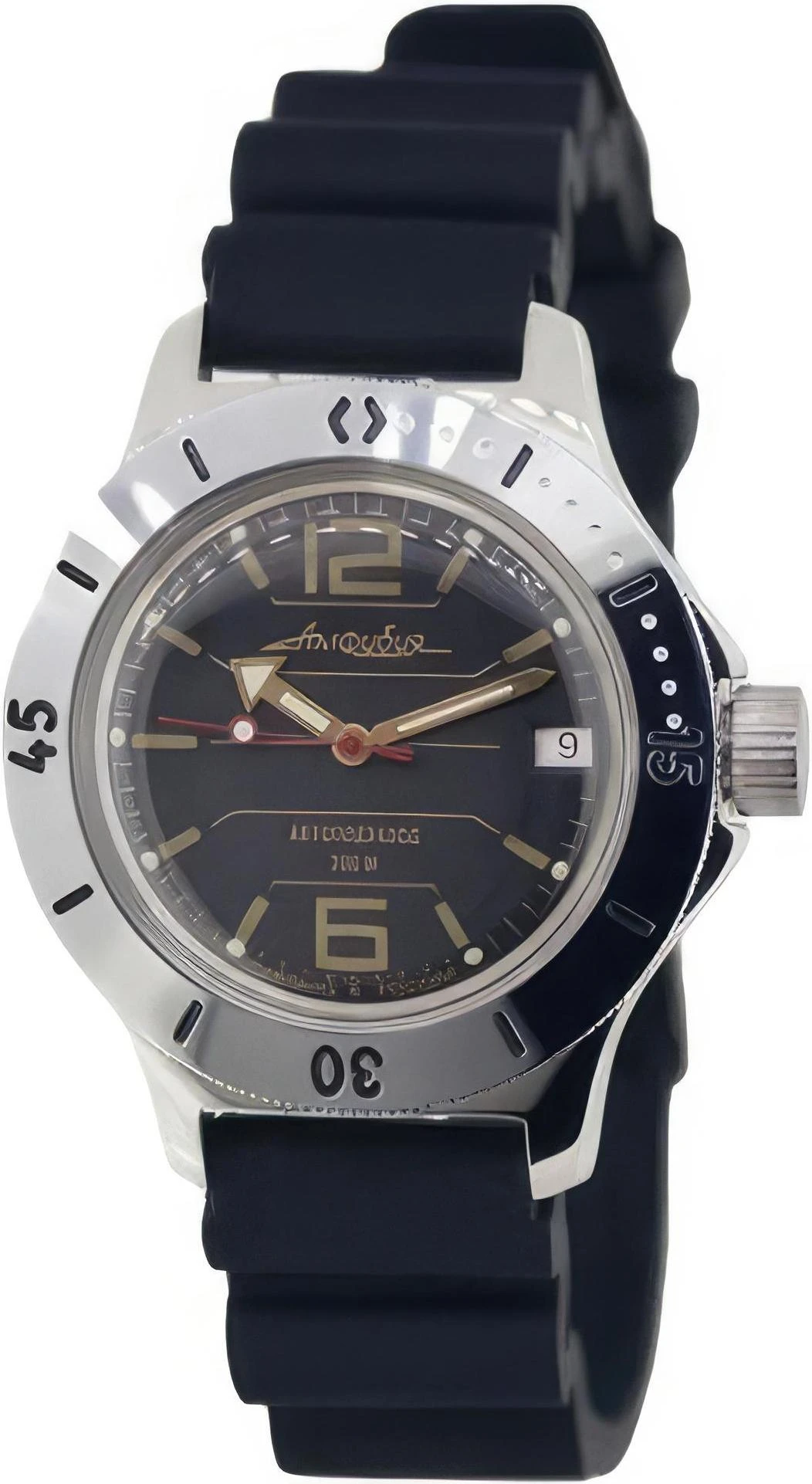 Мужские наручные часы Восток Амфибия 120697. Механические с автоподзаводом. Пружина механизма заводится автоматически благодаря естественным движениям владельца в процессе ежедневной носки часов. Корпус изготовлен из высококачественной нержавеющей стали 316L с высокими антикоррозийными свойствами. На стрелки и отметки нанесен светонакопительный состав, благодаря этому считывать информацию с циферблата возможно и в темноте. На циферблате отображается текущее число месяца. Ремешок изготовлен из каучука. Органическое стекло. Часы являются водонепроницаемыми до 20 Бар. Цвет корпуса: Черный. Цвет циферблата: Черный. Ширина (с заводной головкой): 42мм. Толщина: 15мм. Гарантия: 1 год.