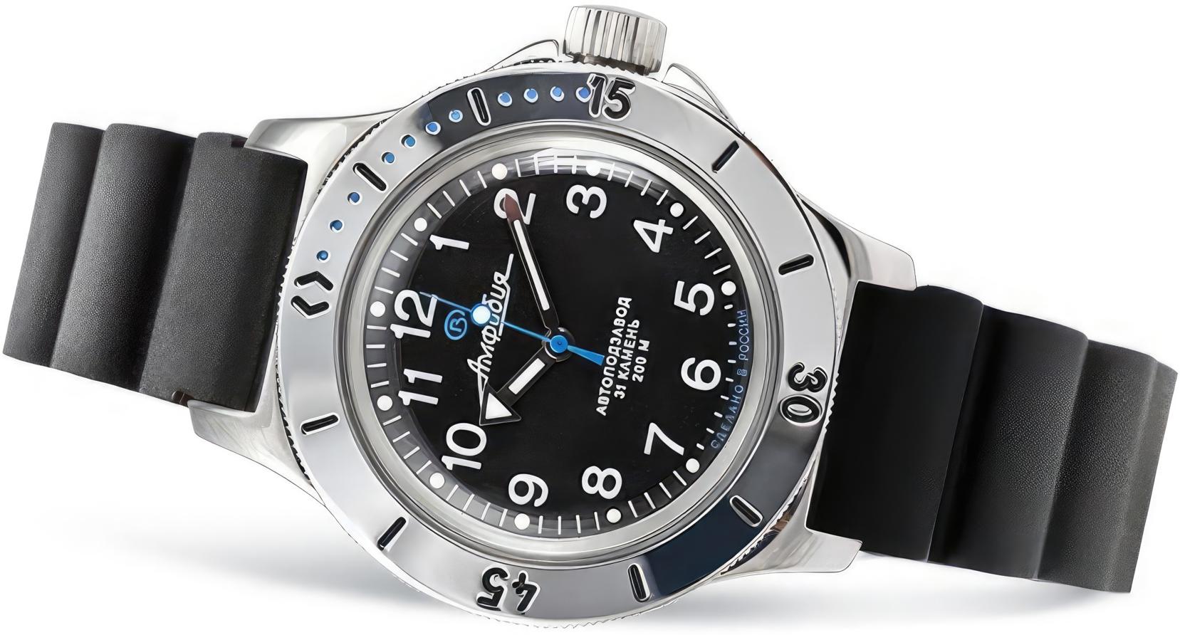 Мужские наручные часы Восток Амфибия 120811. Механические с автоподзаводом. Пружина механизма заводится автоматически благодаря естественным движениям владельца в процессе ежедневной носки часов. Корпус изготовлен из высококачественной нержавеющей стали 316L с высокими антикоррозийными свойствами. На стрелки и отметки нанесен светонакопительный состав, благодаря этому считывать информацию с циферблата возможно и в темноте. Полимерный ремешок. Натуральный полимерный материал является идеальным для изготовления ремешка благодаря своей чрезвычайной прочности и гибкости. Органическое стекло. Часы являются водонепроницаемыми до 20 Бар. Цвет корпуса: Черный. Цвет циферблата: Черный. Ширина (с заводной головкой): 42мм. Толщина: 15мм. Гарантия: 1 год.