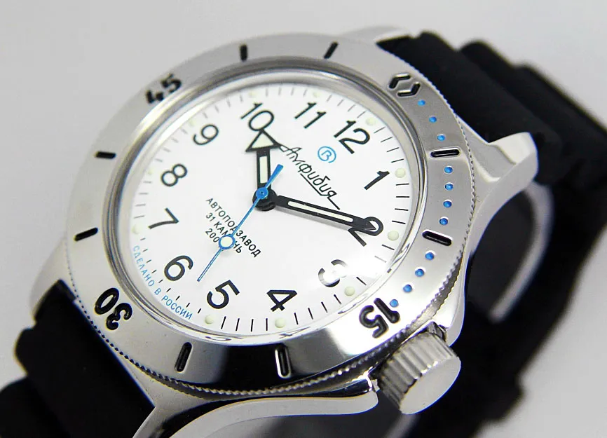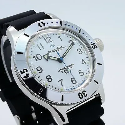 Мужские наручные часы Восток Амфибия 120813. Механические с автоподзаводом. Пружина механизма заводится автоматически благодаря естественным движениям владельца в процессе ежедневной носки часов. Корпус изготовлен из высококачественной нержавеющей стали 316L с высокими антикоррозийными свойствами. На стрелки и отметки нанесен светонакопительный состав, благодаря этому считывать информацию с циферблата возможно и в темноте. Ремешок изготовлен из каучука. Органическое стекло. Часы являются водонепроницаемыми до 20 Бар. Цвет корпуса: Белый. Ширина (с заводной головкой): 42мм. Толщина: 15мм. Гарантия: 1 год.