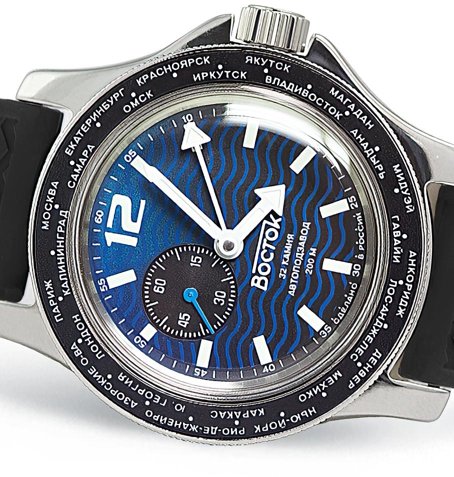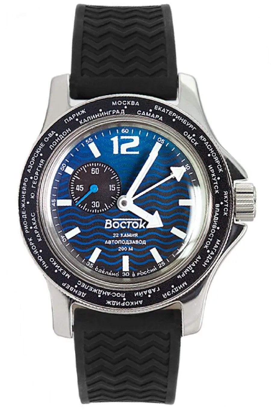 Мужские наручные часы Восток Амфибия 13004В. Механические с ручным подзаводом. Полимерный ремешок. Натуральный полимерный материал является идеальным для изготовления ремешка благодаря своей чрезвычайной прочности и гибкости. Ударопрочная конструкция часов защищает от ударов и вибрации. Отображение времени возможно в 12-часовом или 24-часовом формате. Браслет из нержавеющей стали. Органическое стекло. Часы являются водонепроницаемыми до 3 Бар. Цвет циферблата: Черный. Цвет корпуса: Синий. На стрелки и отметки нанесен светонакопительный состав, благодаря этому считывать информацию с циферблата возможно и в темноте. Высота (с ушками): 49 мм. Толщина: 15 мм. Гарантия: 1 год.